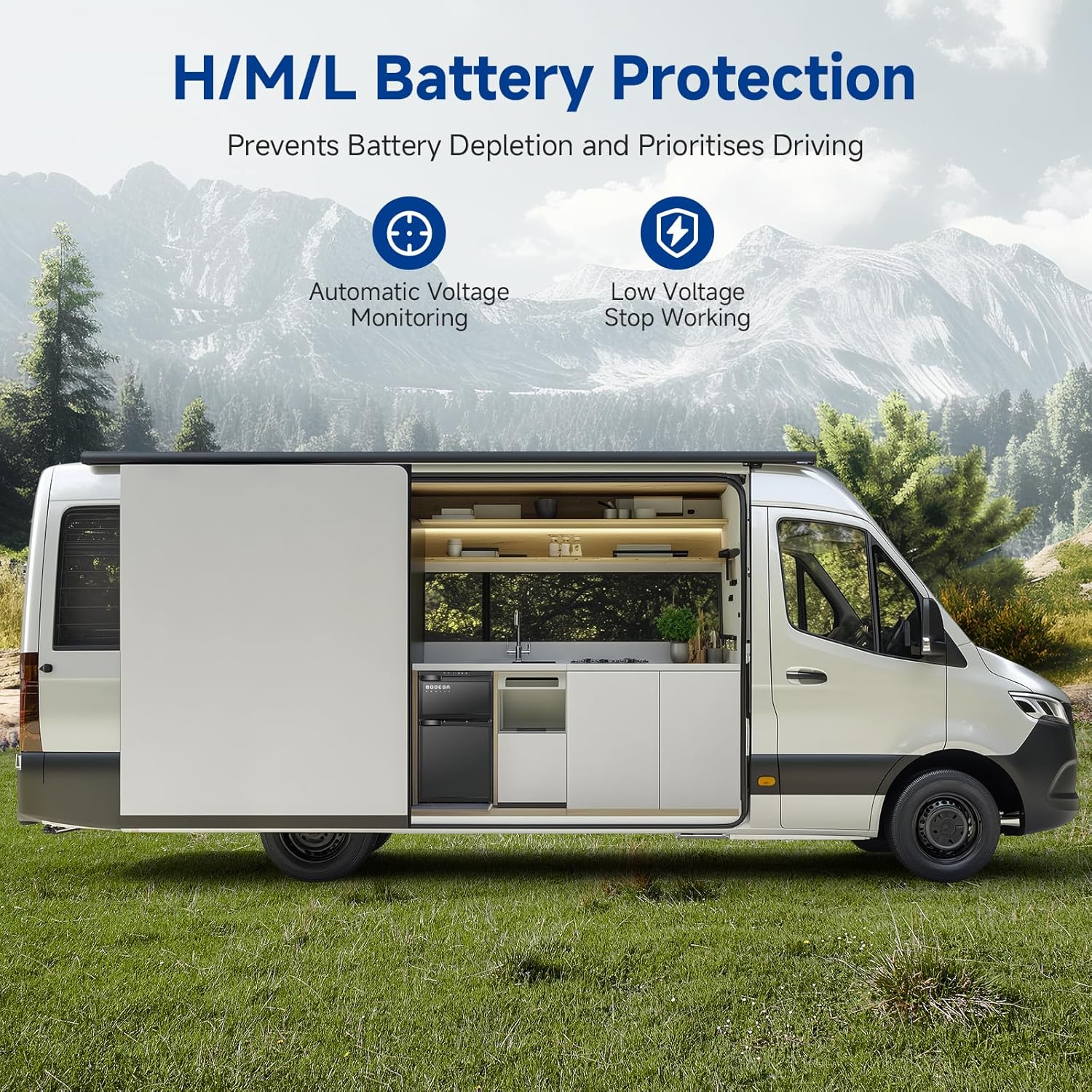 Rapid Cooling & APP Control: BODEGACOOLER 12 Volt RV fridge supports both manual control and smart APP control (iOS/Android). You can check or set the temperature, voltage, cooling mode and more using the APP. Equipped with powerful compressor technology, it achieves freezing temperatures as low as -4°F (-20°C), with an adjustable range from -4°F to 68°F (-20°C to 20°C) to accommodate both refrigeration and freezing needs. Let this compact travel refrigerator companion enhance every journey.