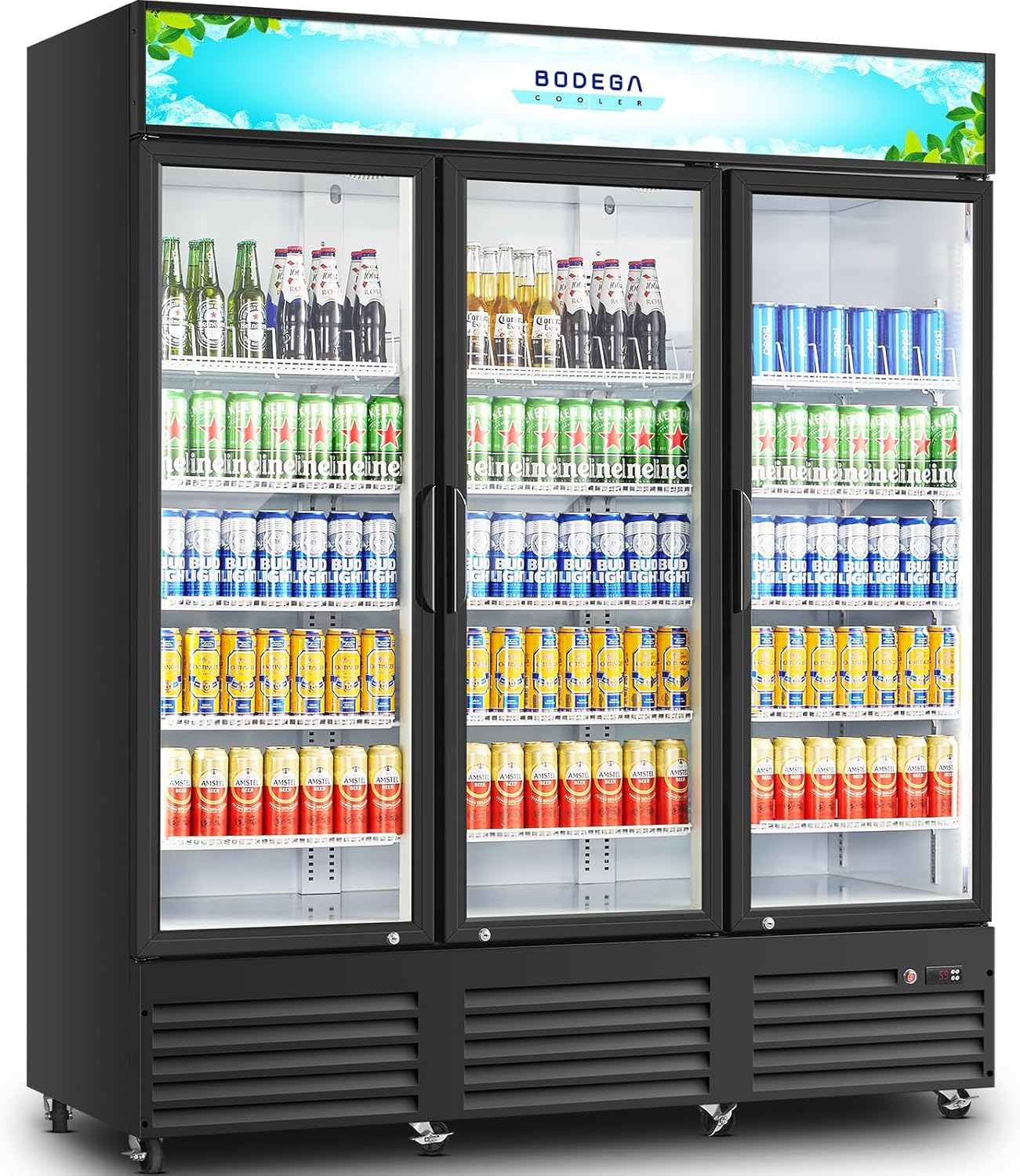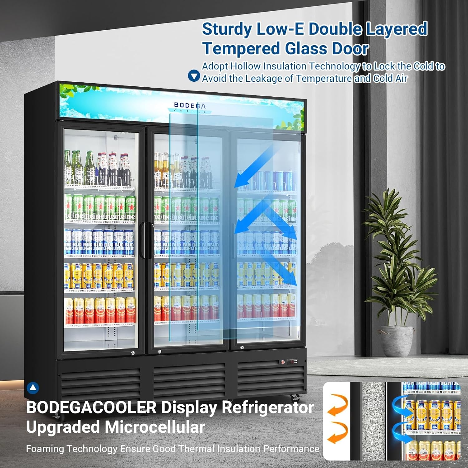 Versatile Merchandising : BODEGACOOLER three-door merchandiser refrigerator serves as a versatile merchandising solution, perfect for showcasing a wide range of products, including commercial beverage refrigerators, display refrigerators, and other commercial refrigerators. Its spacious interior allows for effective product placement and eye-catching displays. 53 Cu. Ft Merchandiser Display Refrigerator is perfect for multiple scenarios