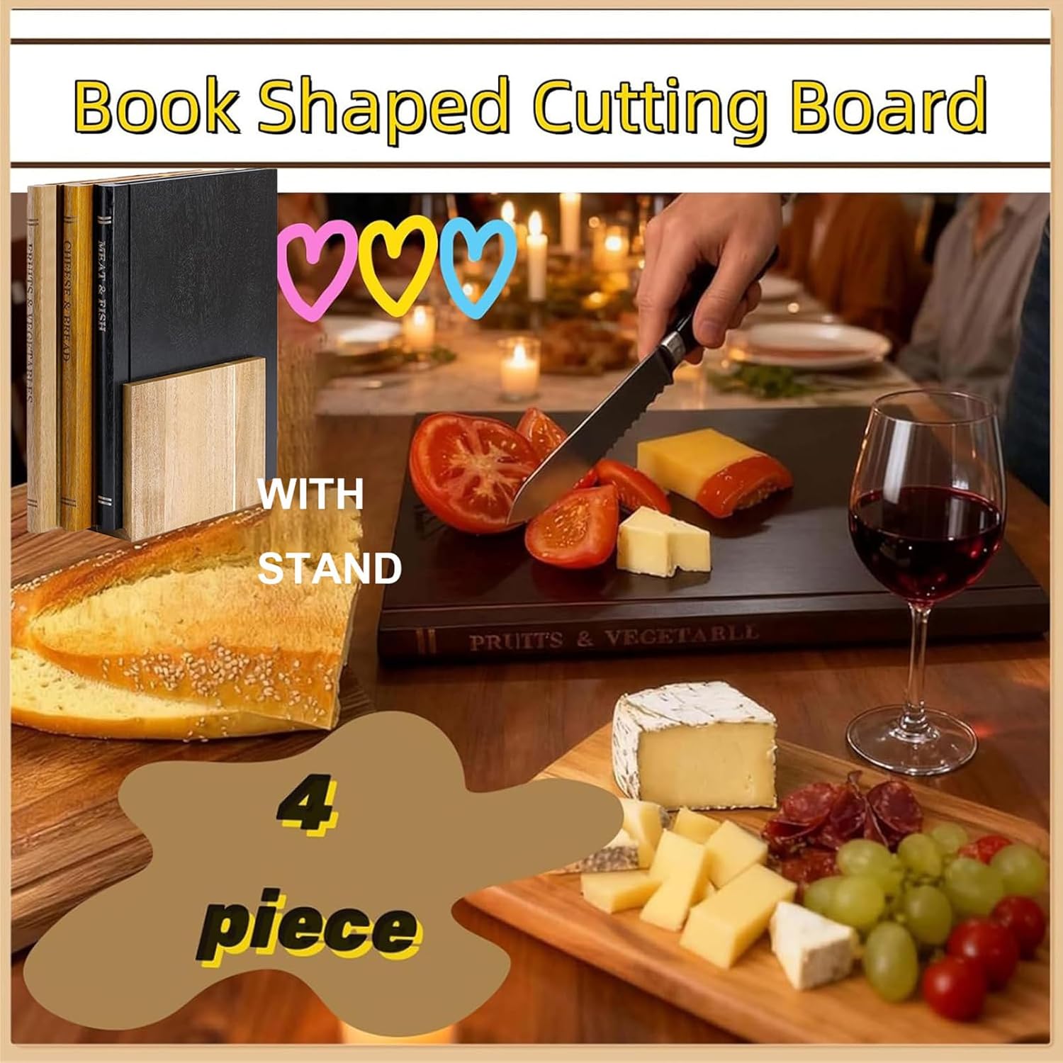 Book Themed Cutting Board Set With Stand Book Cutting Board Set Of 3 With Wooden Stand Book Cutting Board Set That Look Like Books, Wood Book Shaped Cutting Board For Cooking Chef Fruits Meat (Wood)