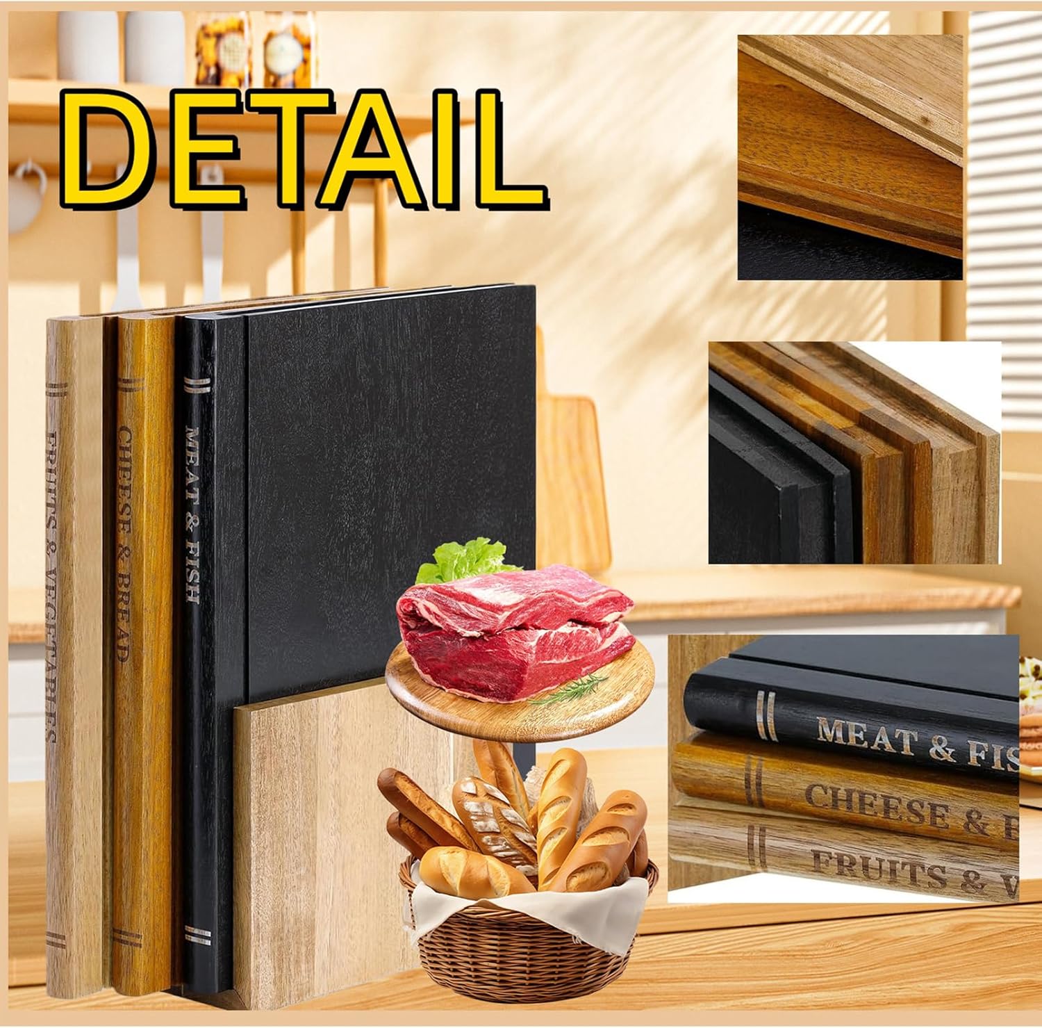 ➽▶➤ Cutting Board Library Book Set Of 3 / Unique Design – Our wooden cutting boards for kitchen are designed to resemble books, adding a whimsical touch to your decor. This book-shaped cutting board set not only serves as essential cooking tools but also doubles as eye-catching kitchen decorative .This thoughtful labeling promotes efficient food prep while ensuring cross-contamination is avoided, making these cutting boards that look like books a practical addition to your kitchen.
