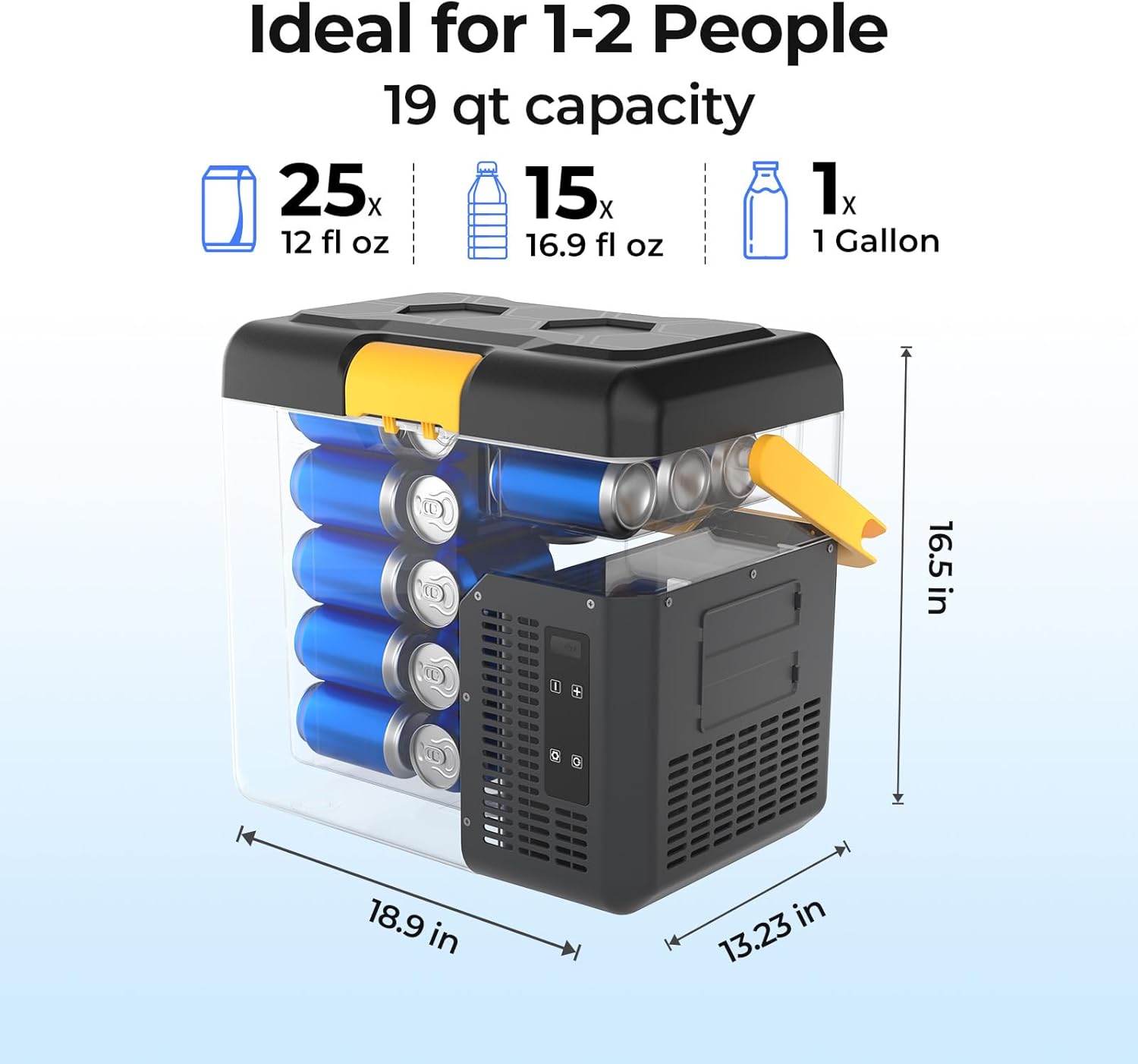 19 Quart Generous Capacity: This compact freezer can hold up to 25 cans of 12 fl oz soda or 15 bottles of 16.9 fl oz water, making it ideal for 1-2 people. Great for camping, road trips, and other outdoor activities, enjoy the convenience of chilled beverages and food on the go