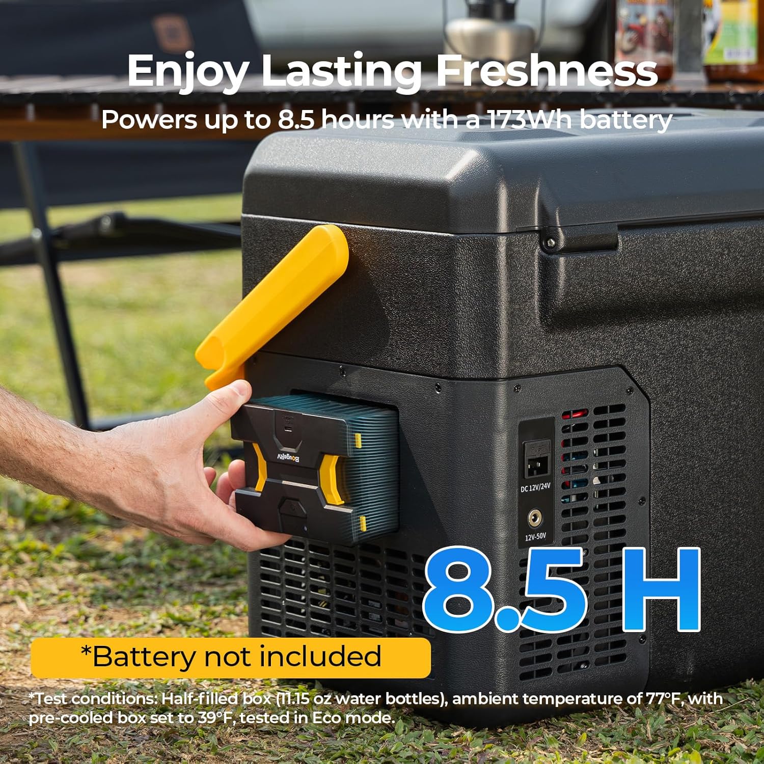 Battery Compatibility: This portable freezer pairs effortlessly with our 173Wh detachable battery, providing up to 8.5 hours of cooling when the freezer is set to ECO mode. NOTE: The 173Wh Battery is sold separately