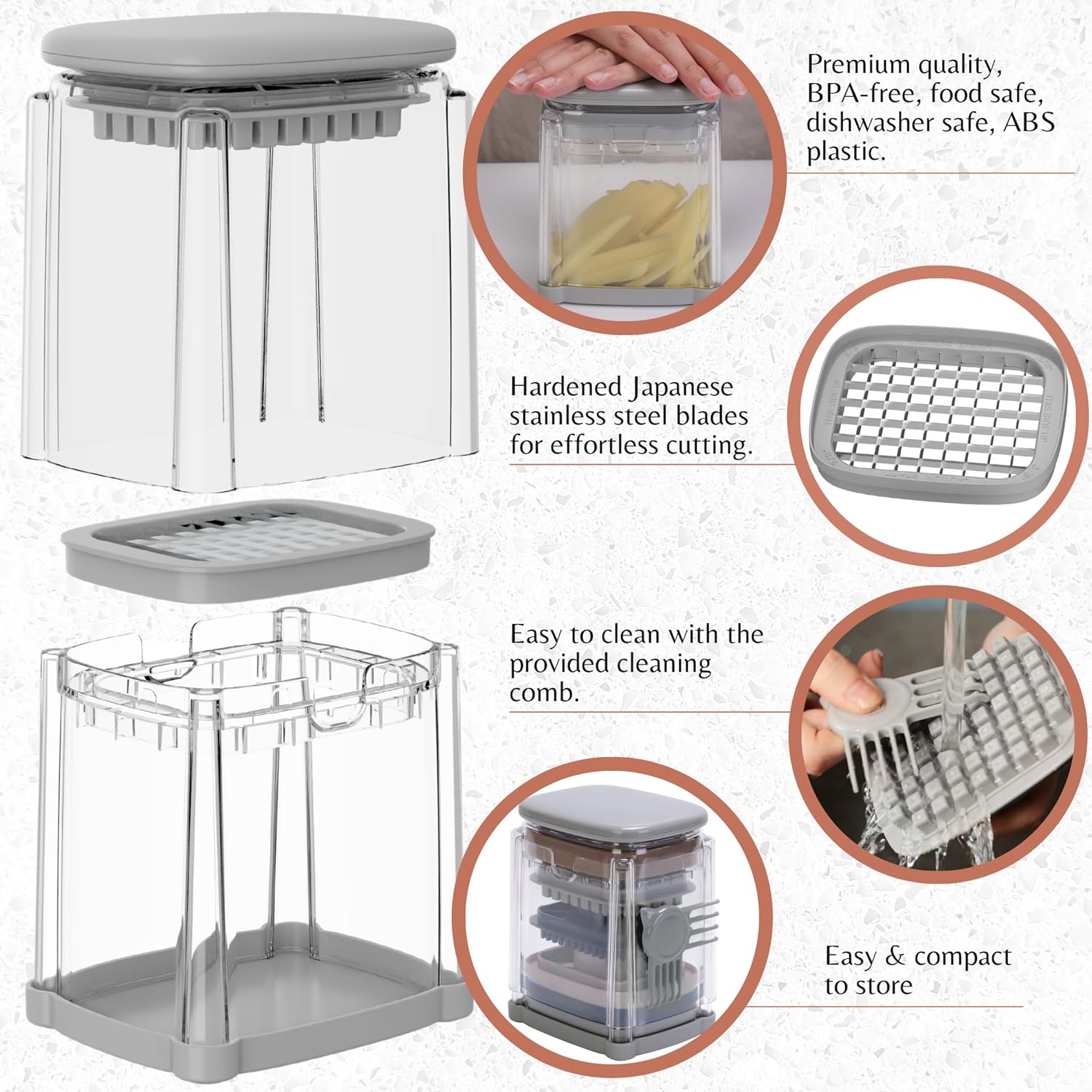 🎁 Complete Package and Great Value: The set includes 4 stainless steel blades (1/4″ dicer, 3/8″ dicer, 6-wedge, 8-wedge) and a cleaning comb. In addition, you get 5 exclusive Brieftons recipe Ebooks for culinary inspiration. Compact and functional, the vegetable chopper fits perfectly in any kitchen. It’s ideal for home cooks, busy parents, or anyone looking to simplify meal prep. It works great as a potato cutter for fries, egg cutter, strawberry slicer, or as a vegetable cutter and slicer.