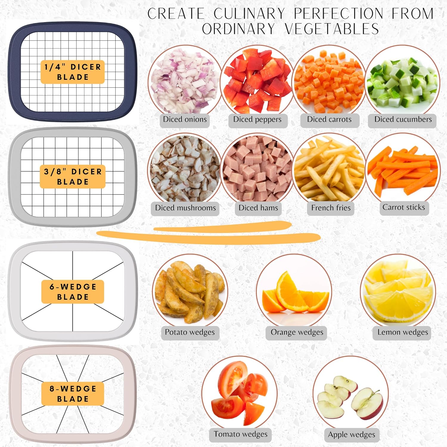🌟 Perfect Vegetable Chopper: Achieve professional results in seconds with our veg chopper! This manual food chopper can chop, slice, dice, cube and wedge vegetables (potato, tomato, cucumber, zucchini, carrot, onion, mushroom), and fruits (orange, lemon, strawberry, avocado, banana, kiwi, apple). It’s also an excellent egg slicer, ham chopper, wedge cutter, and potato cutter for French fries. Make meal prep quick & easy with consistent, uniform cuts for salads, fries, soups, stir fries & more.