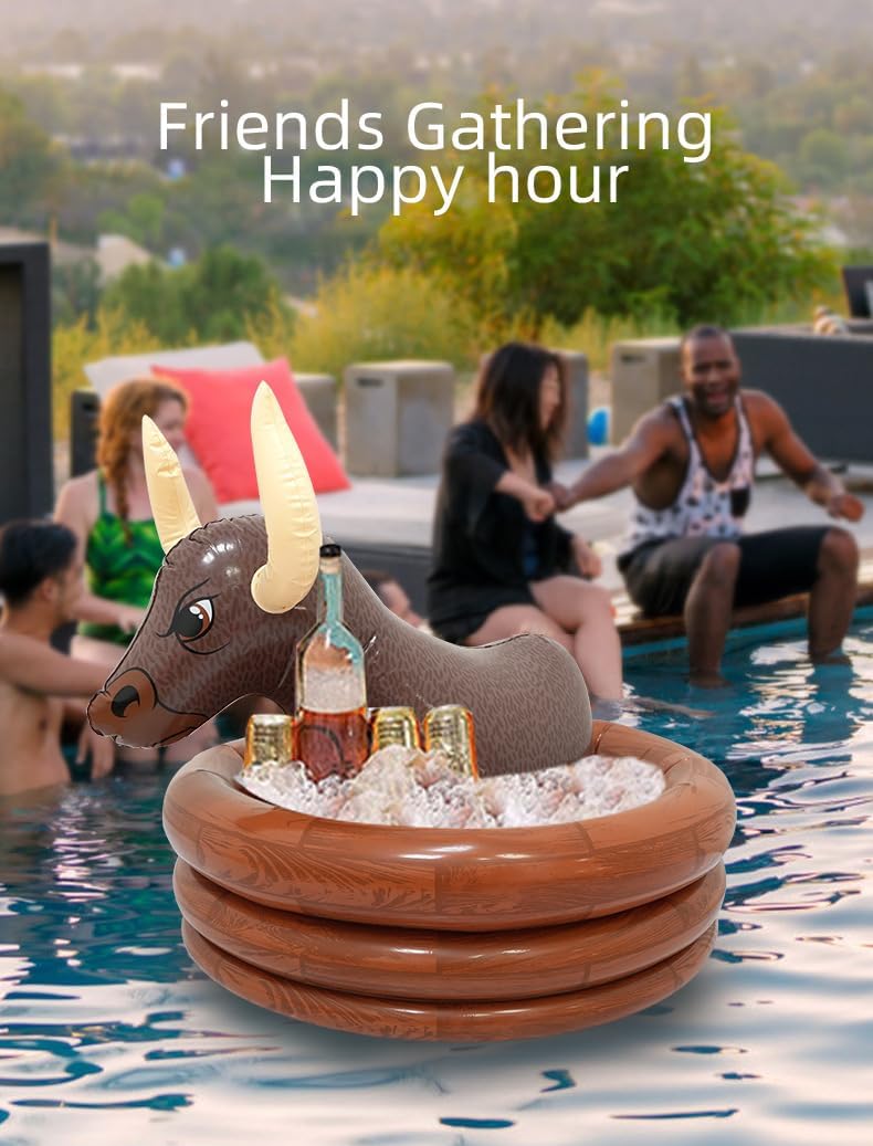 Inflatable Ice Bucket made of heavy duty thick PVC, Lightweight and portable, making it easy to bring along and enjoy with friends and family anywhere,Bull shape design,players take turn tossing the rings at the inflatable Bull Ice Bucket, the player who gets the most rings around the inflatable bull horn wins a prize