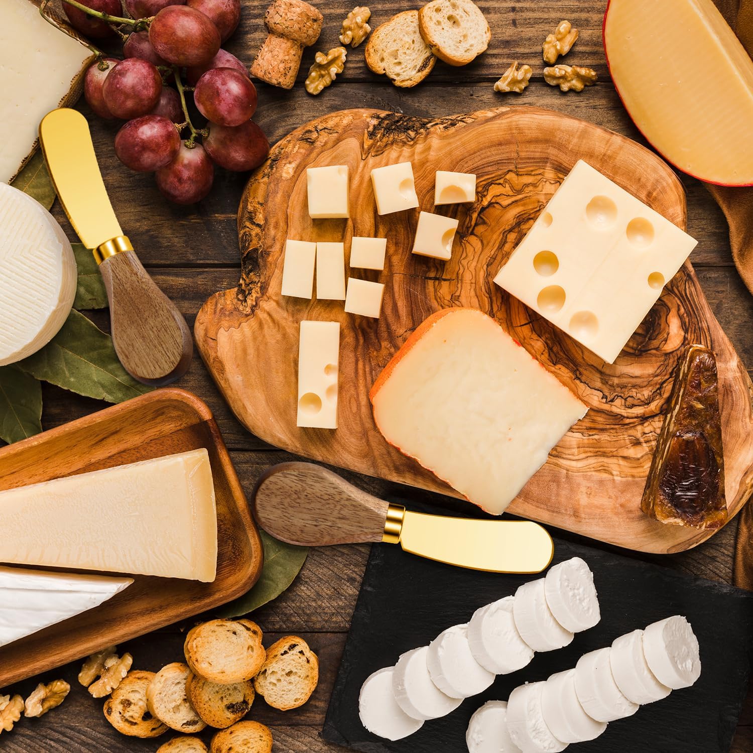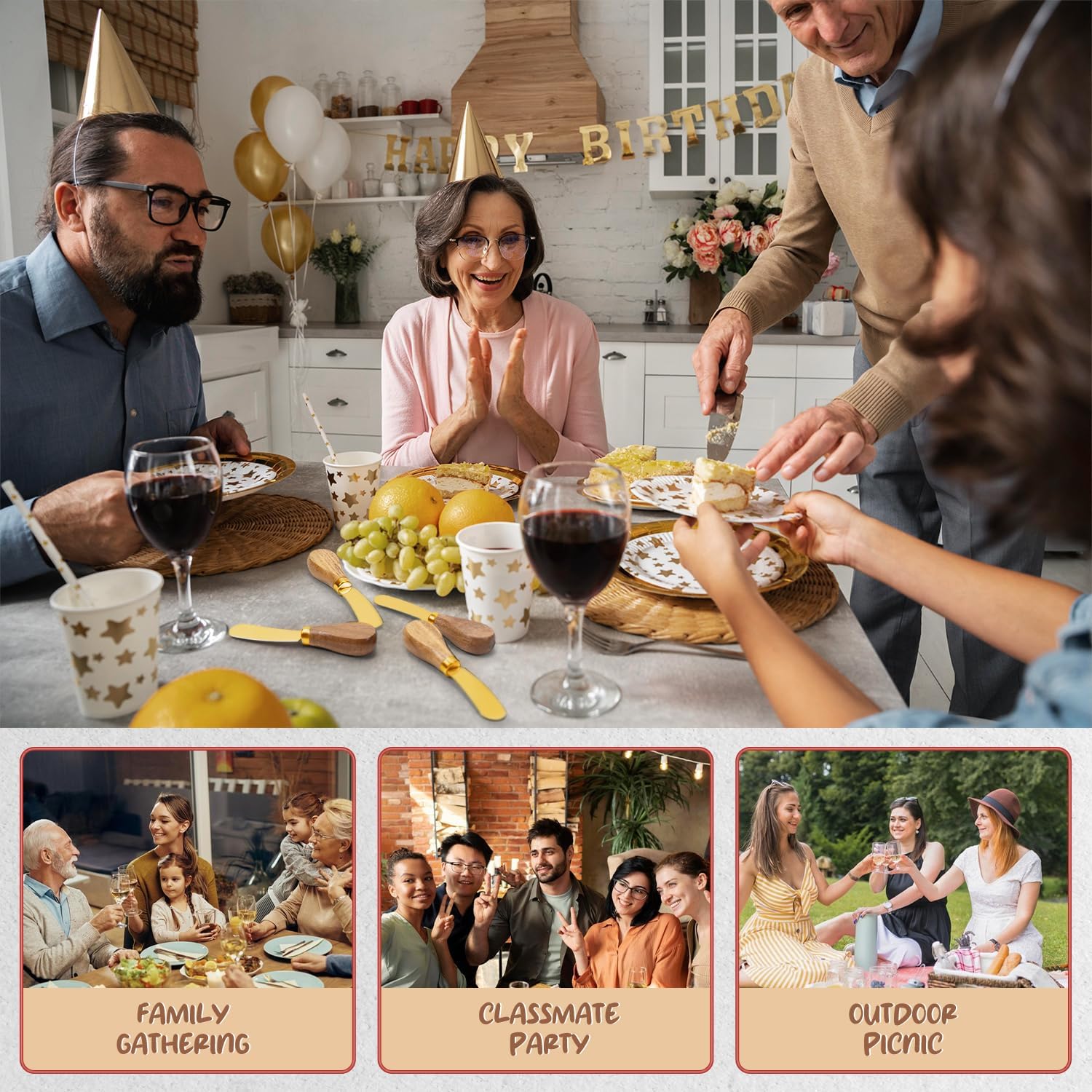 【Cheese Spreader Knives Set of 4】This set includes 4 gold butter spreader knives with natural acacia wood handles. Each spreader knife measures 4.85 inches /12.3 cm in total length, with a blade length of 2.45 inches /6.2 cm and width of 0.86 inches /2.18 cm. The blade is sharp enough to easily cut through cheese, butter, and more. Compact and refined, this small butter knife is both practical and elegant. It offers a comfortable grip, making slicing and spreading effortless.