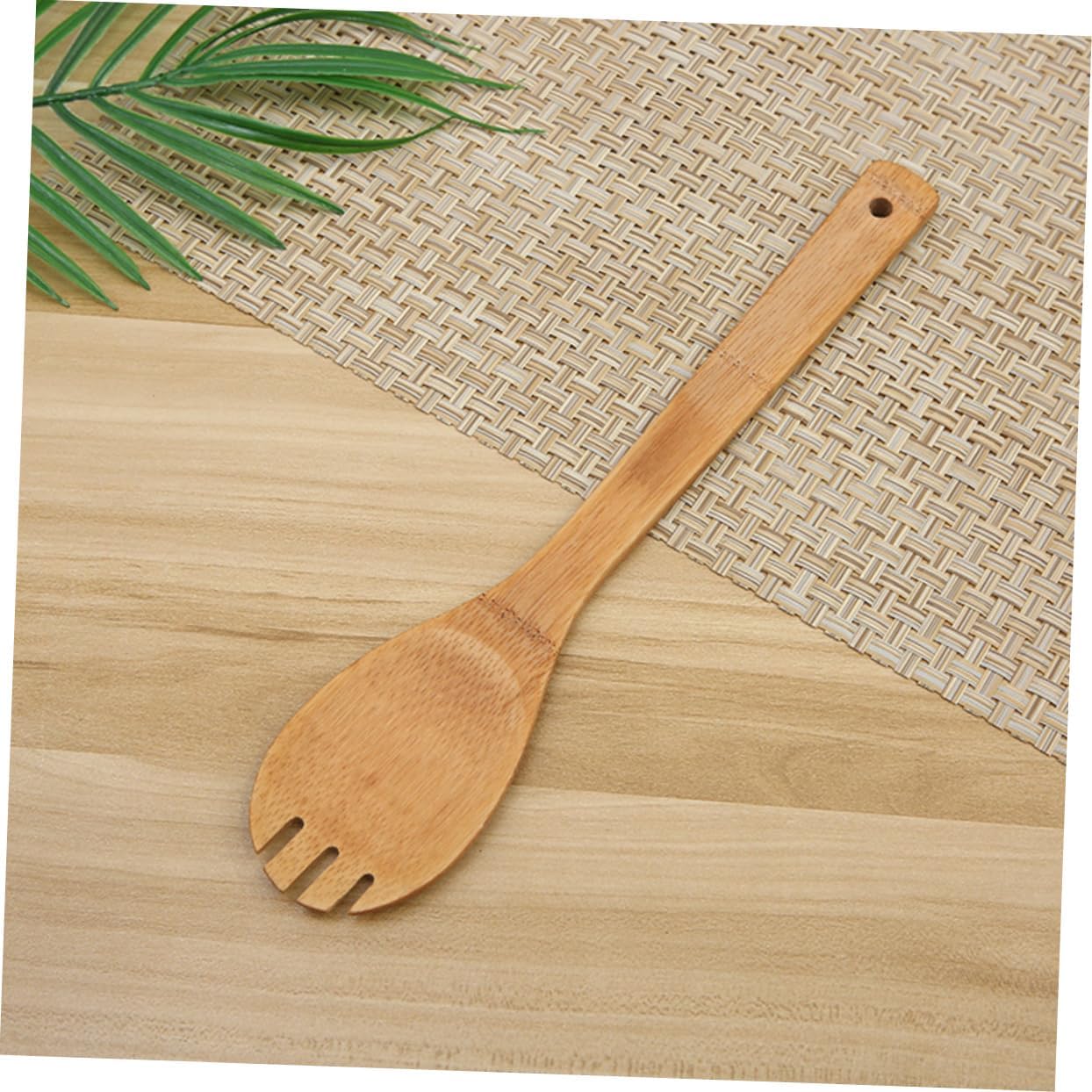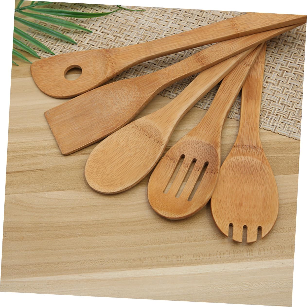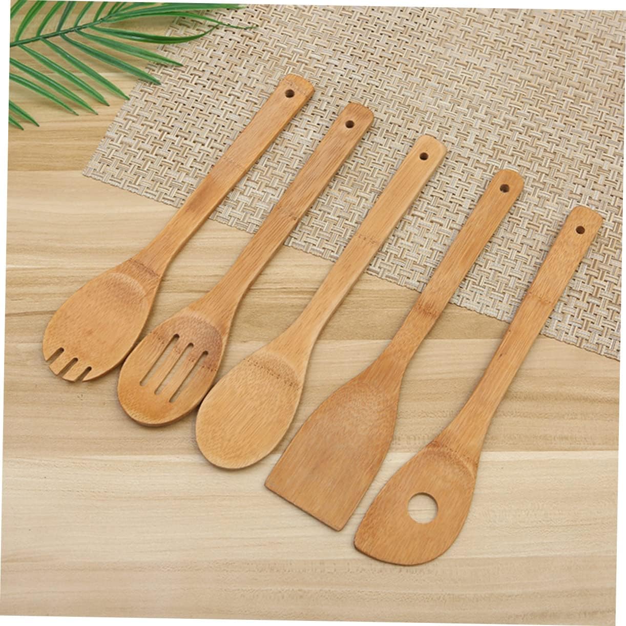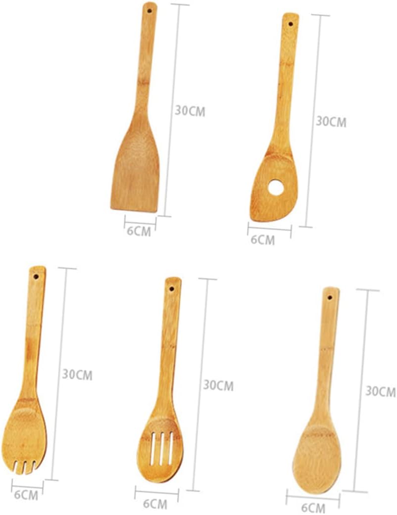 – Set includes turner spatula, single hole mixing spoon, slotted spoon, spoon, rounded fork wooden cooking utensils.