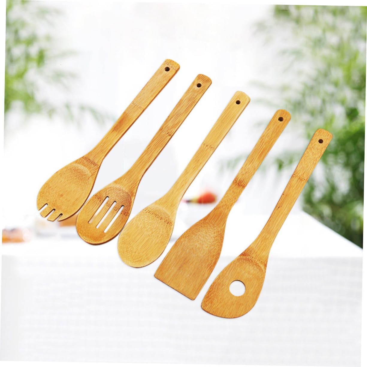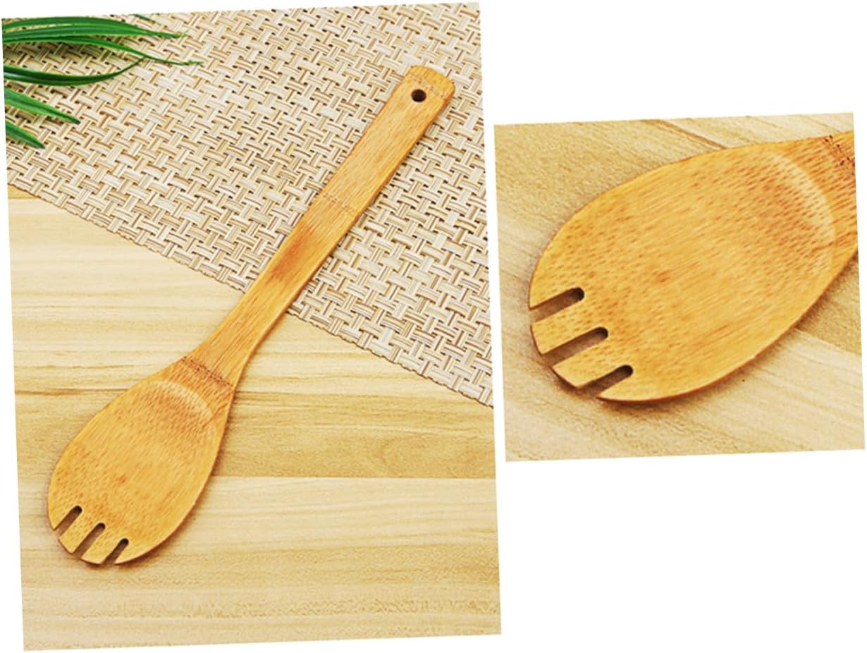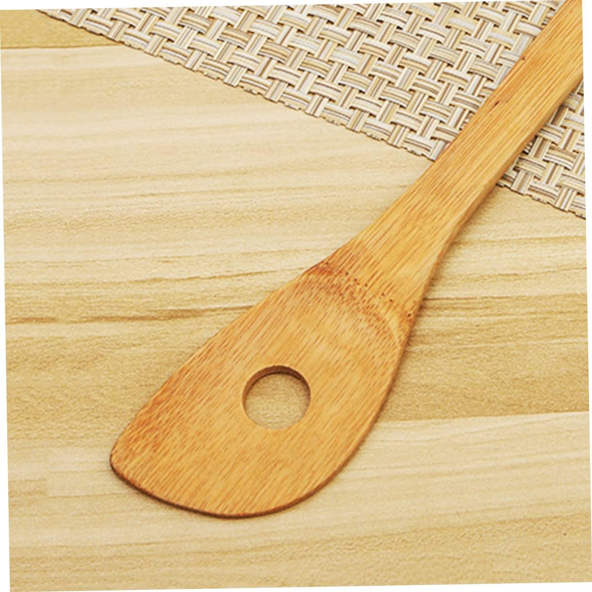 – Set includes turner spatula, single hole mixing spoon, slotted spoon, spoon, rounded fork wooden cooking utensils.