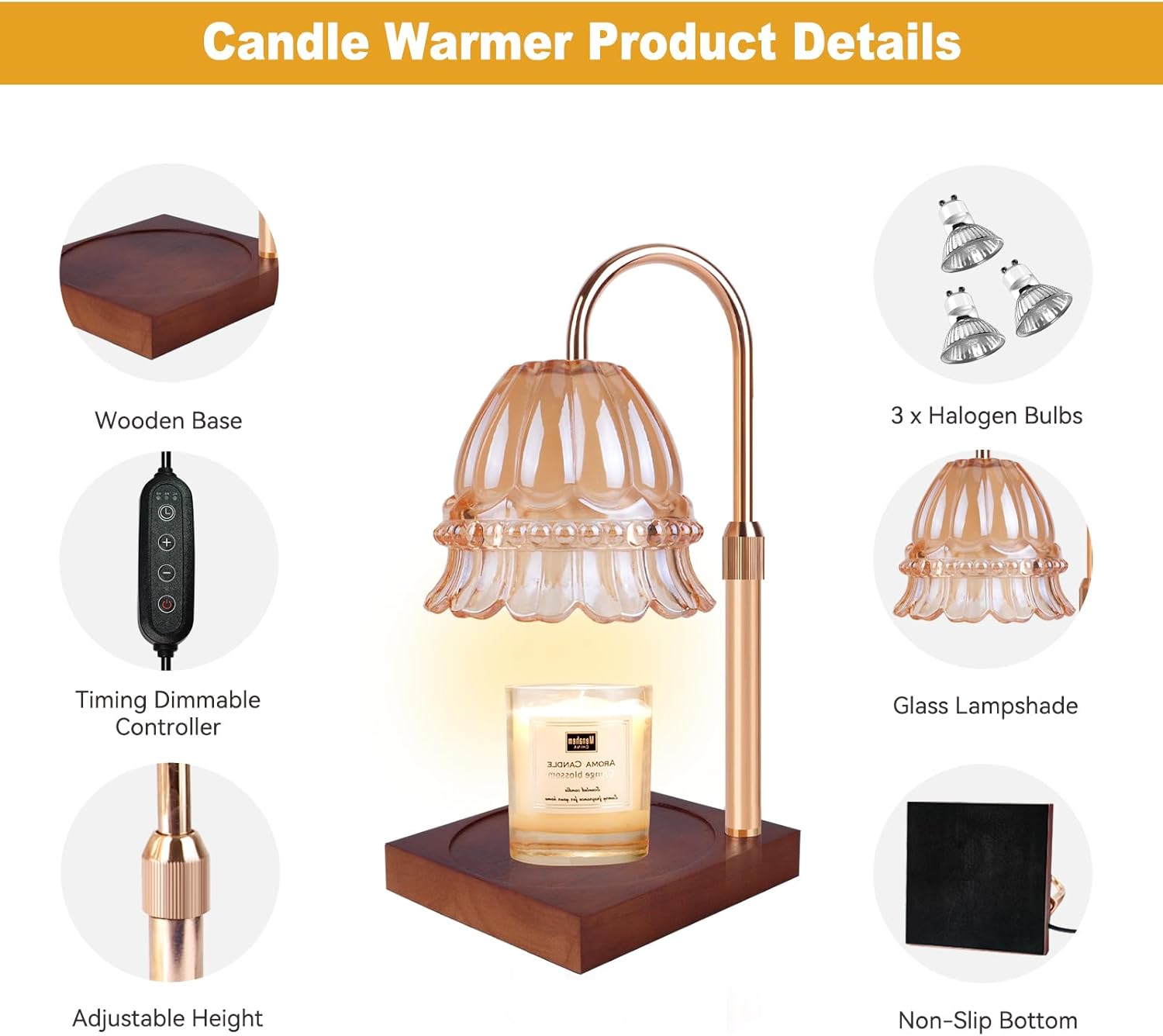 【Safety and Eco-Friendly】Our candle warmer lamp uses a 50-watt halogen bulb(3 bulbs included) to generate heat, melting scented candles uniformly and providing a consistent, lasting fragrance. In comparison to traditional burning methods, the candle lamp warmer eliminates the fire hazards associated with open flames. With added timing and adjustable brightness functions, you can enjoy a comfortable ambiance and delightful aromas without any concerns.