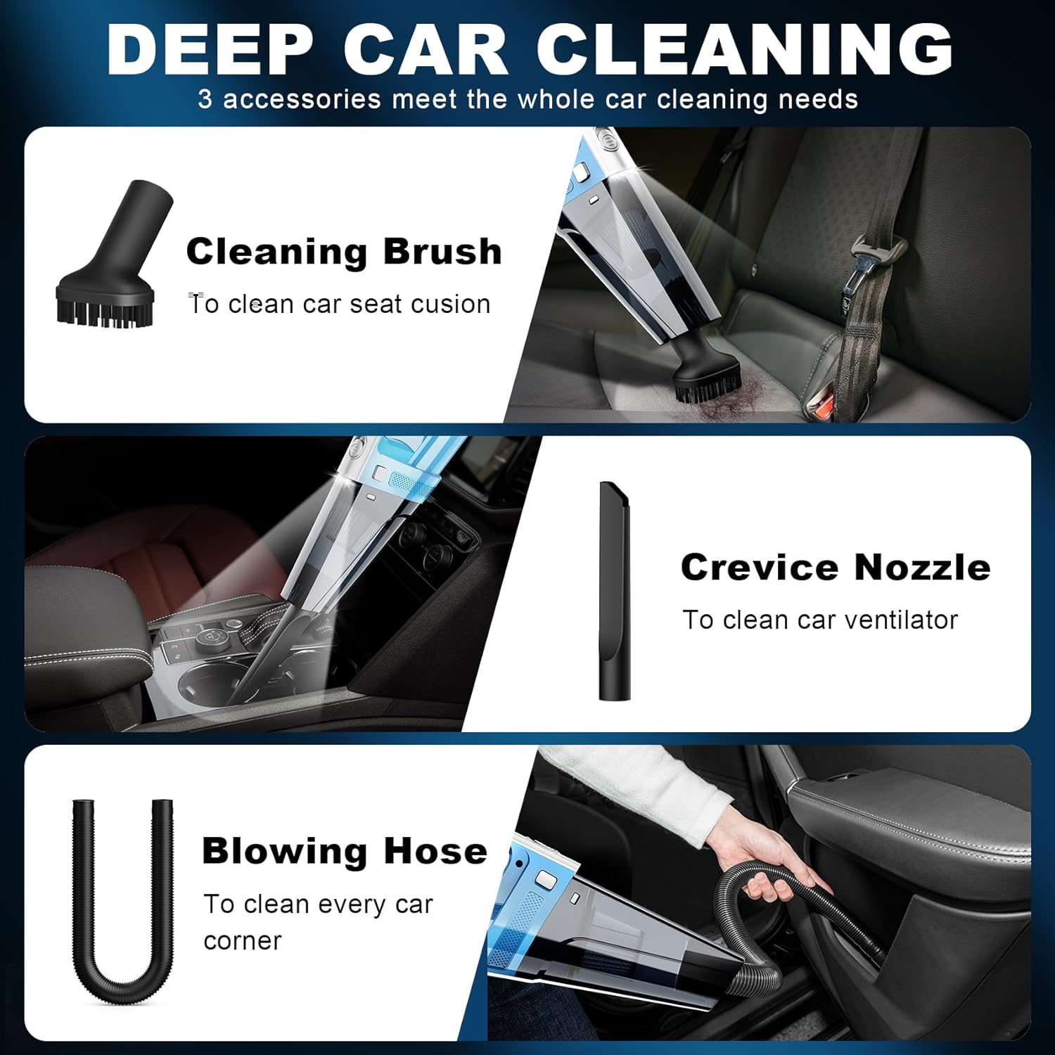 Professional Muti-Cleaning Accessories: The handheld car vacuum is equipped with multi-cleaning tools meet all your car cleaning needs, which are dusting brush, crevice nozzle and extendable hose that suit for cleaning all the car interiors as seats, console, dash, door or hard-to-reach corners.