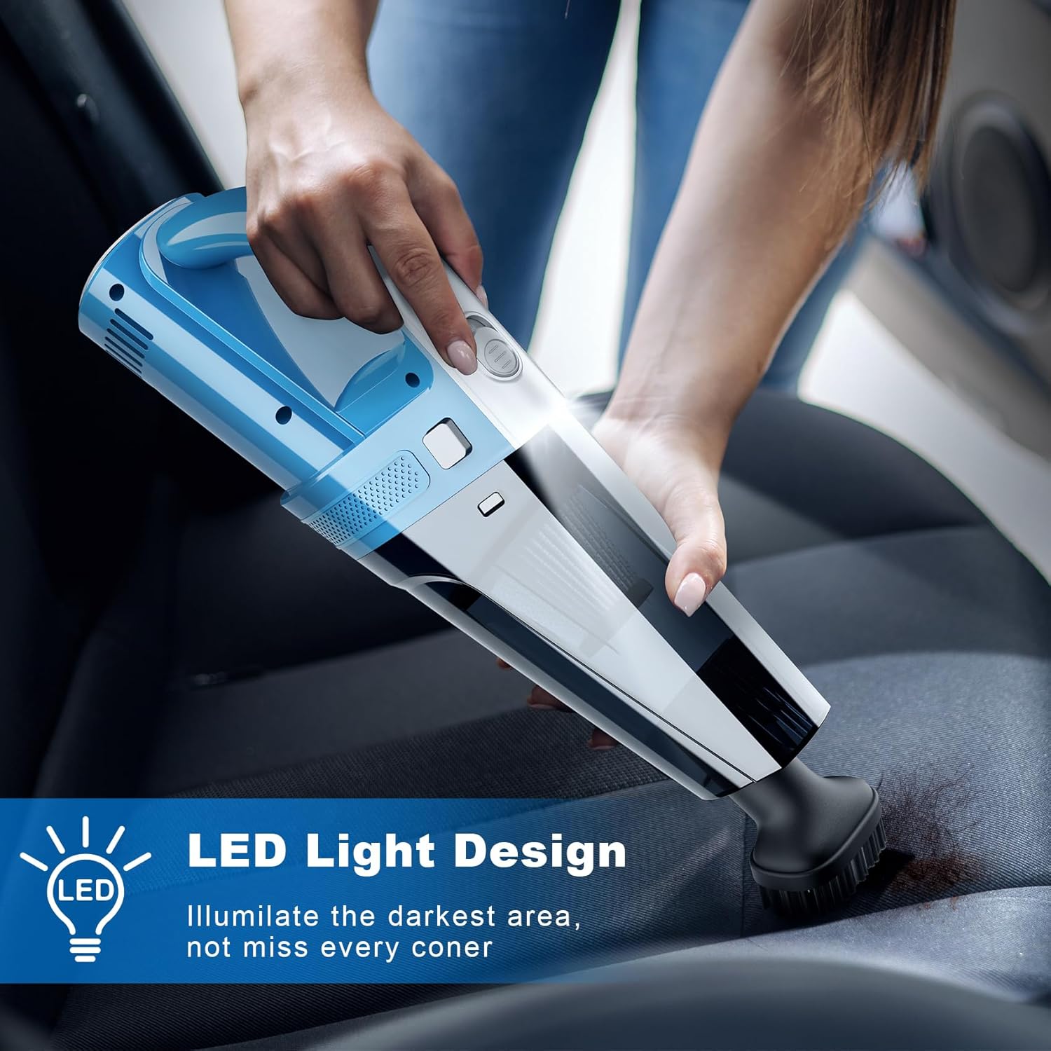 Regular Car Cleaning: The car vacuum utilizes a high-power motor that can offer up to 8000pa suction, which quickly terminates any dirt, debris, dog hair, soil, sand or crumbs. The built-in LED light illuminates dark places, such as under car seat, which makes corner cleaning easier.