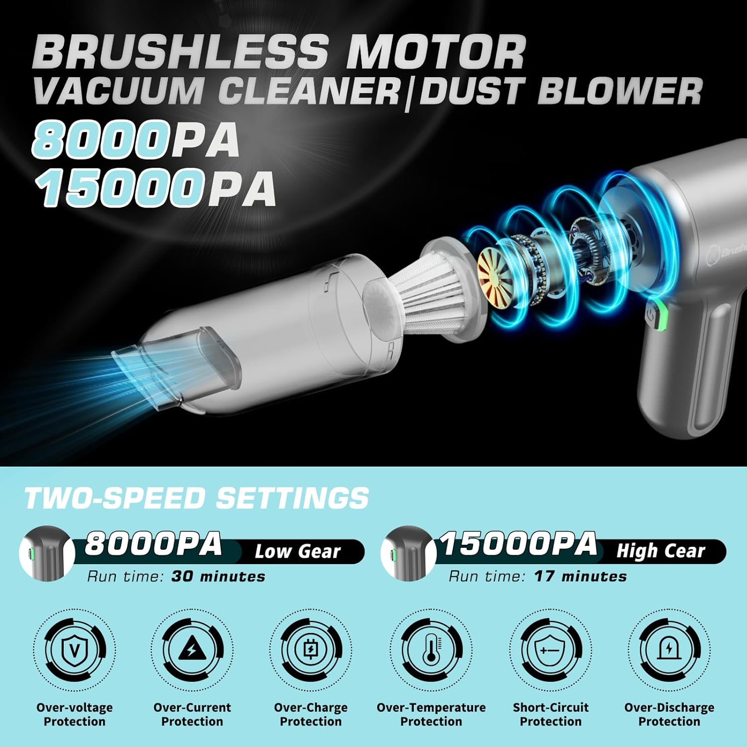 【Powerful 8000PA and 15000PA Suction】 – Our portable car vacuum offers two powerful suction modes, 8000PA and 15000PA, ideal for cleaning your car interior thoroughly. Designed for everyday use, it effectively handles dirt, dust, and debris. Simply press and hold for 3 seconds to power on and switch between modes with a quick press.