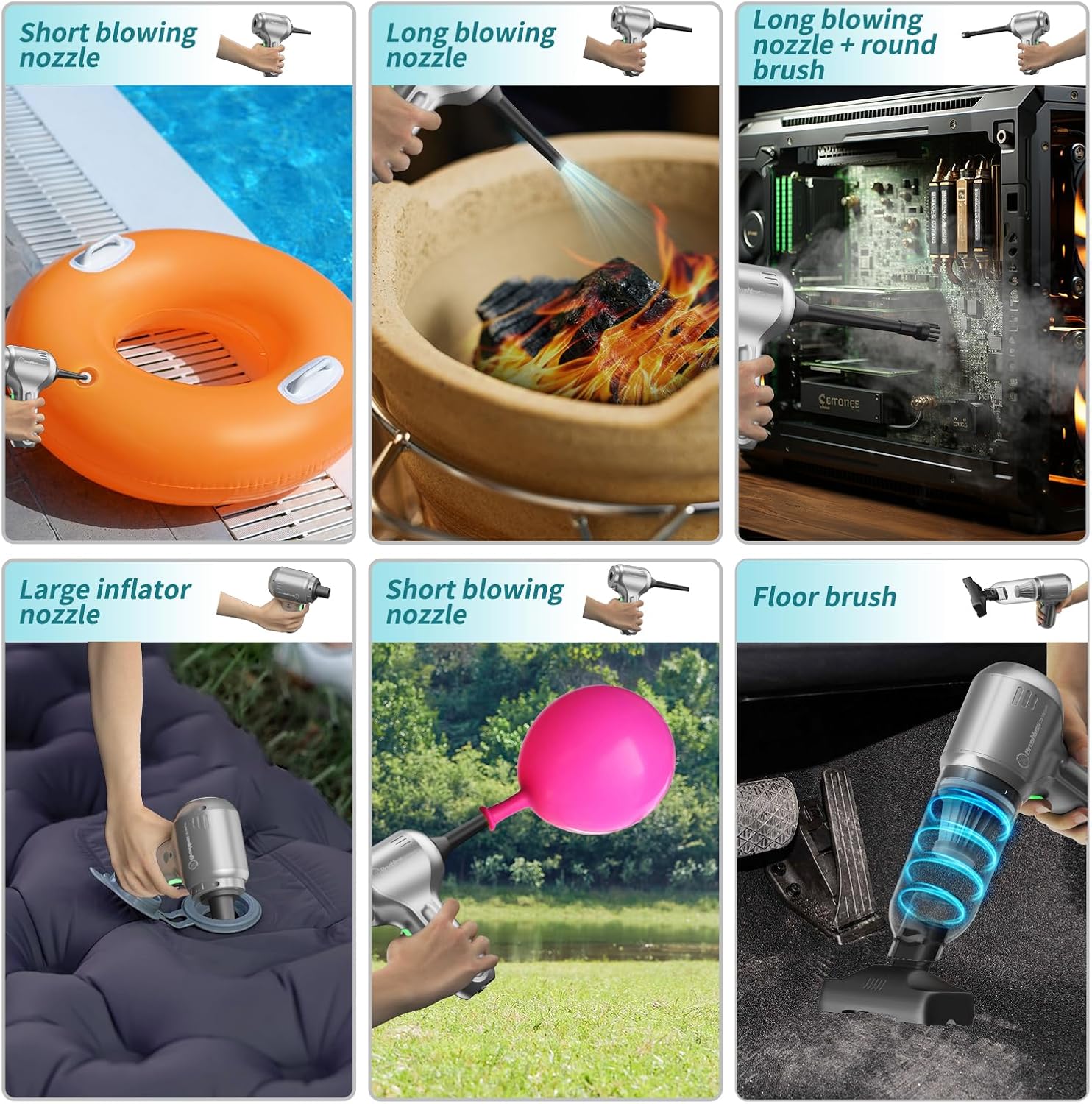 【All-in-One Vacuum, Blower, and Pump】 – This 3-in-1 mini vacuum cleaner combines vacuuming, blowing, and pumping functions, making it a versatile tool for your car and home. Clean crumbs, pet hair, and dust from carpets, upholstery, and tight spaces. Additionally, use it as a BBQ fan or a tire inflator, enhancing its functionality.