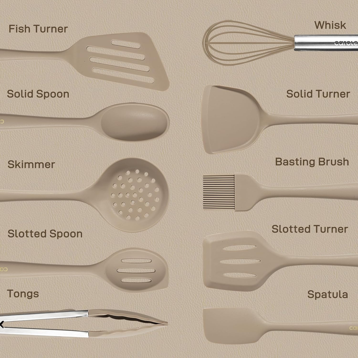 Essential Kitchen Set: This 10-piece silicone cooking utensil set includes everything you need: solid turner, slotted turner, fish turner, solid spoon, slotted spoon, basting brush, skimmer, spatula, tongs, whisk. It’s ideal for a variety of cooking tasks.