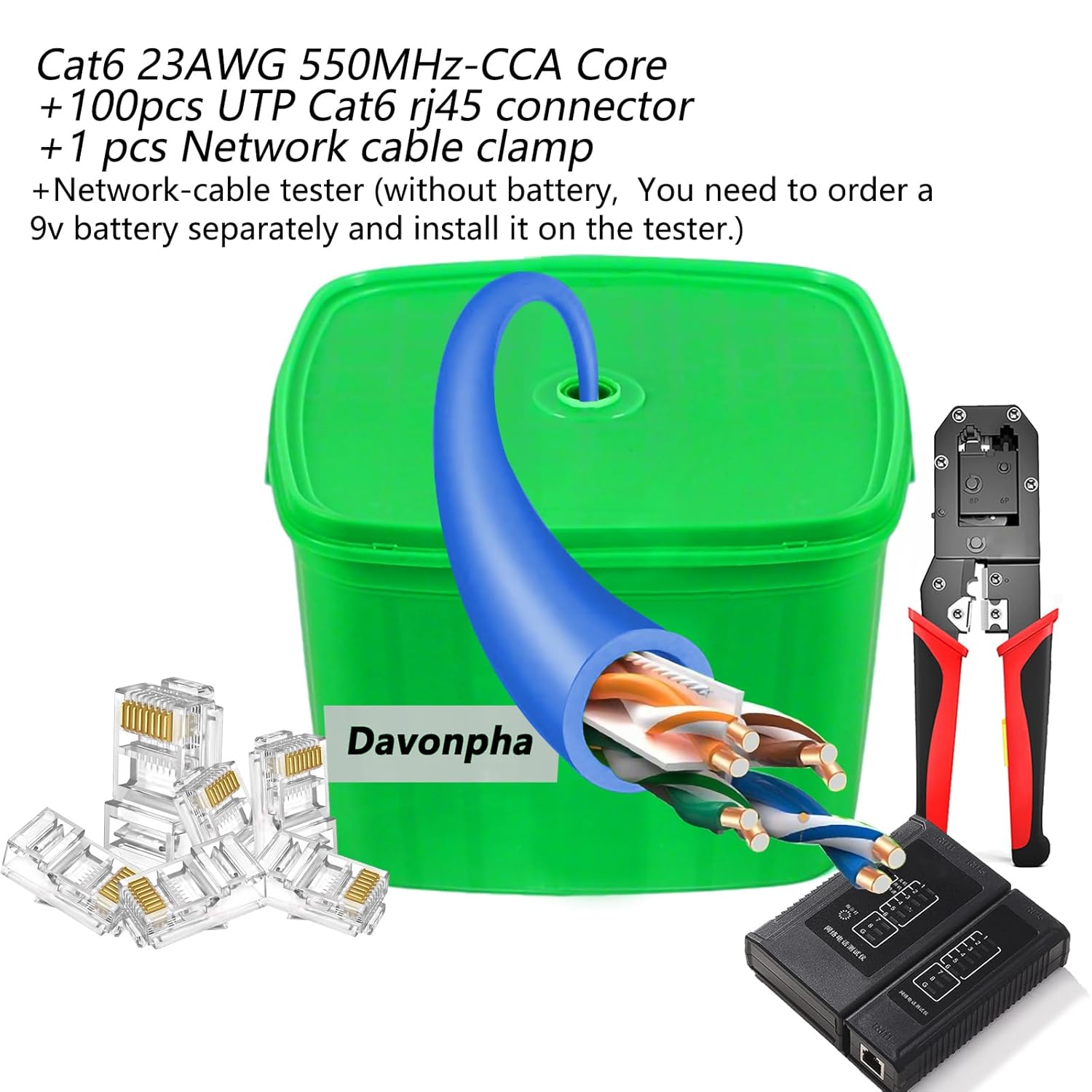 Budget Cat6 Kit with Tools – 300ft CCA cable + 100 non-shielded connectors + crimper+Network-cable tester (without battery, You need to order a 9v battery separately and install it on the tester.) (inside the box). Ideal for basic home networks.