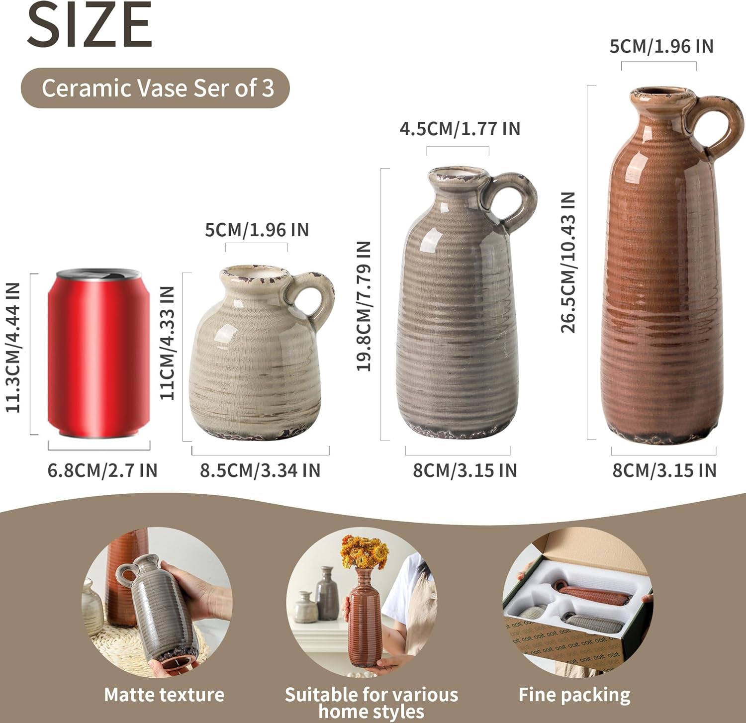 【For Multiple Home Décor Styles】Designed in a variety of shapes and sizes, this rustic vases set is a perfect home décor even without flowers. Whether your style is bohemian, modern farmhouse, rustic, or homey, they all fit in perfectly show off your lifestyle and decorative sense of style. (Length X Diameter=10.43X3.15″, 7.79X3.15″,4.33X3.34″).