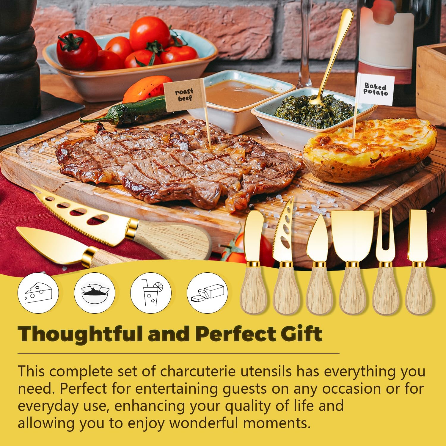 【Complete Charcuterie Utensils Set】The cheese knives and spreaders use advanced integrated technology with comfortable oak wood handles. The mini serving tongs made from premium 304 stainless steel, are durable and resistant to bending or deformation. The mini fork and spoon are suitable for both children and adults. Toothpick markers can be used for cheese, butter, and deli labels.