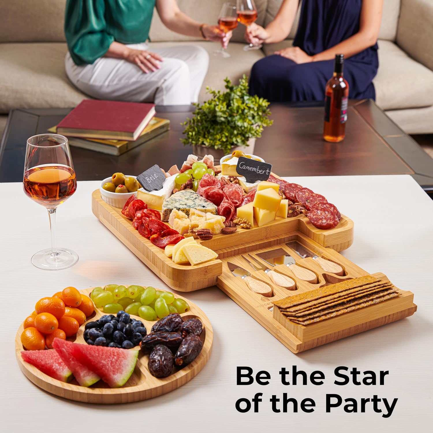 SOLID BUILD AND SMOOTH FINISH: Our large charcuterie board is crafted with premium bamboo to ensure durability and a smooth, elegant finish. It provides a sturdy surface for arranging your cheese tray and other delicacies.