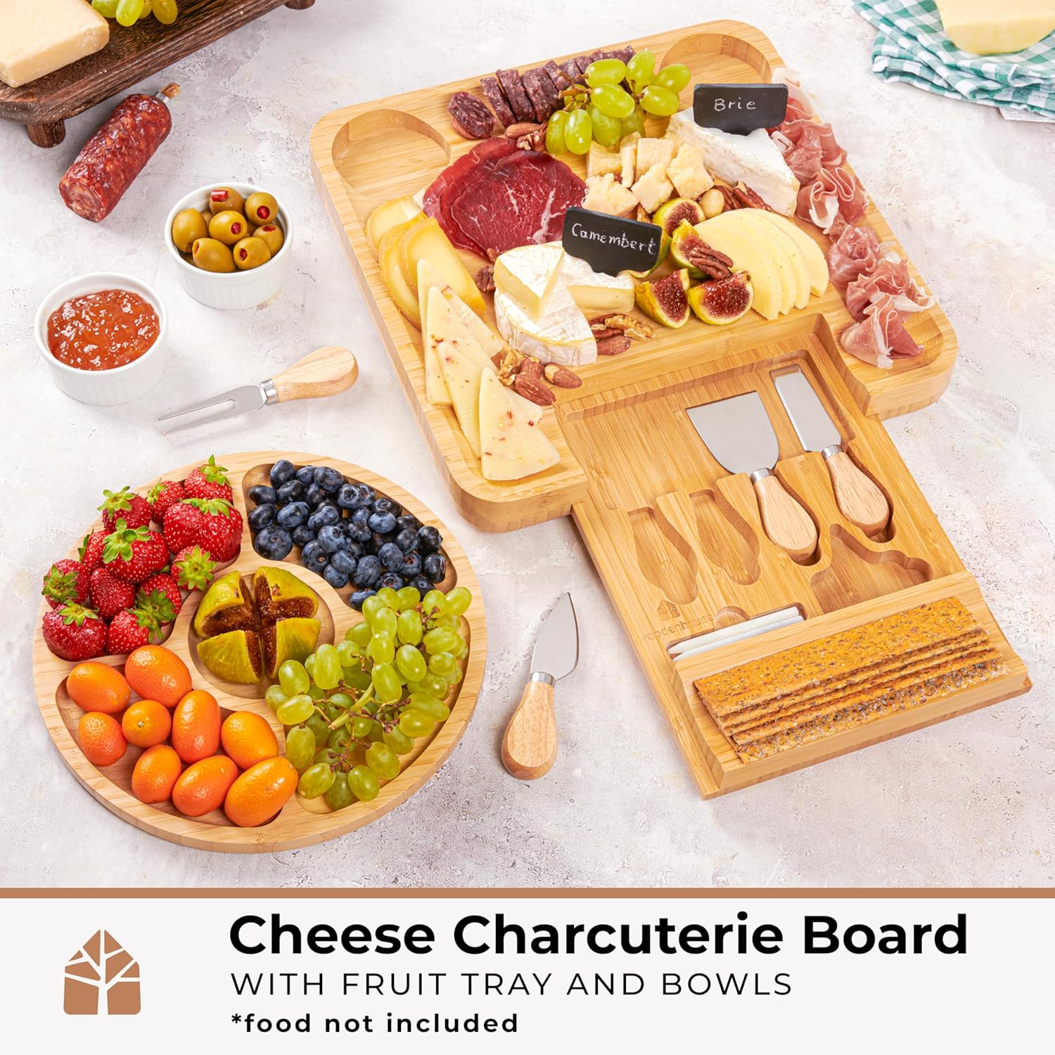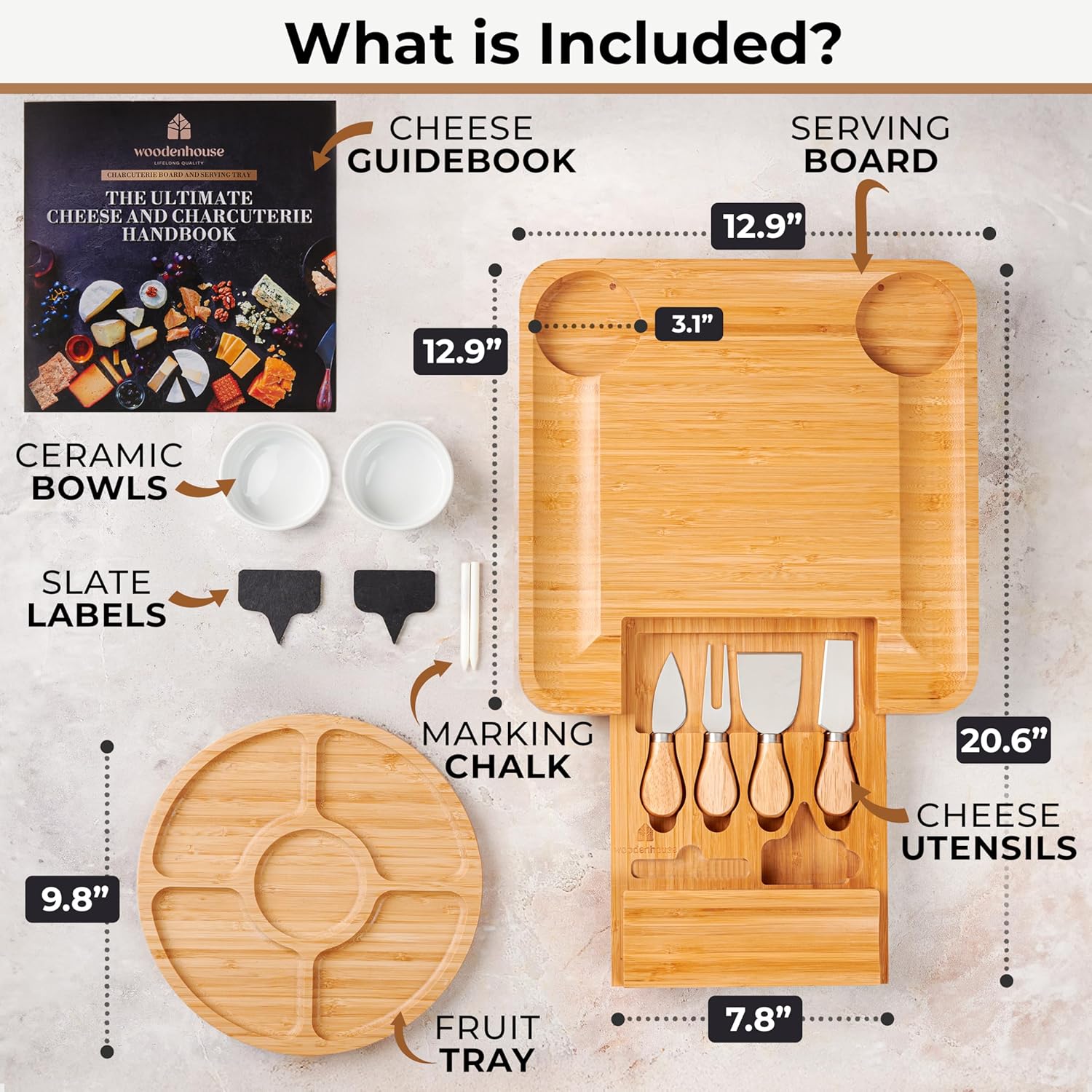 EXPANDED SET WITH EXTRA ITEMS INCLUDED: This Woodenhouse charcuterie board includes a full set of cheese utensils, fruit tray, two bowls, marking chalks and slate labels. Perfect for creating a personalized charcuterie board experience for any gathering.