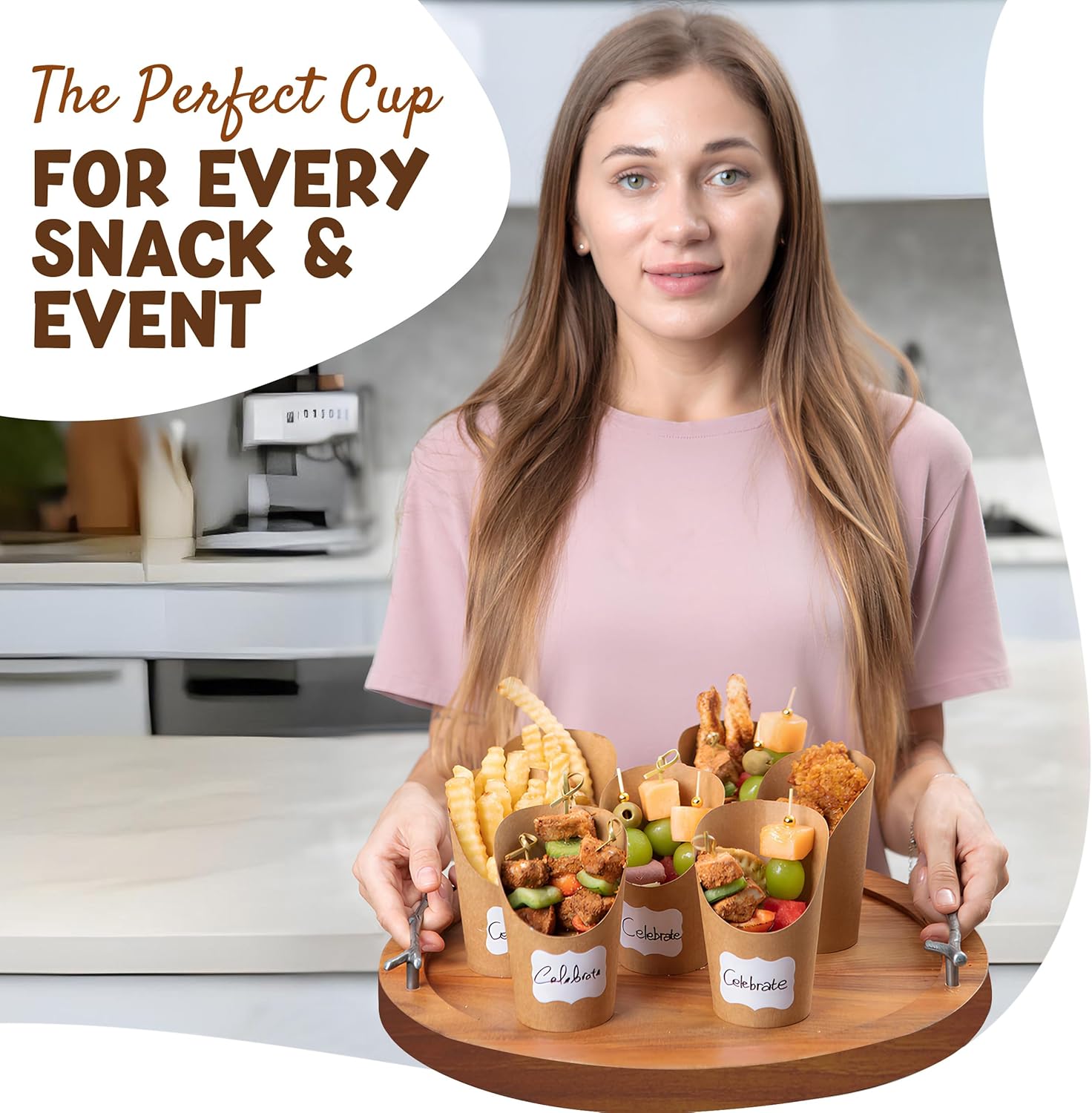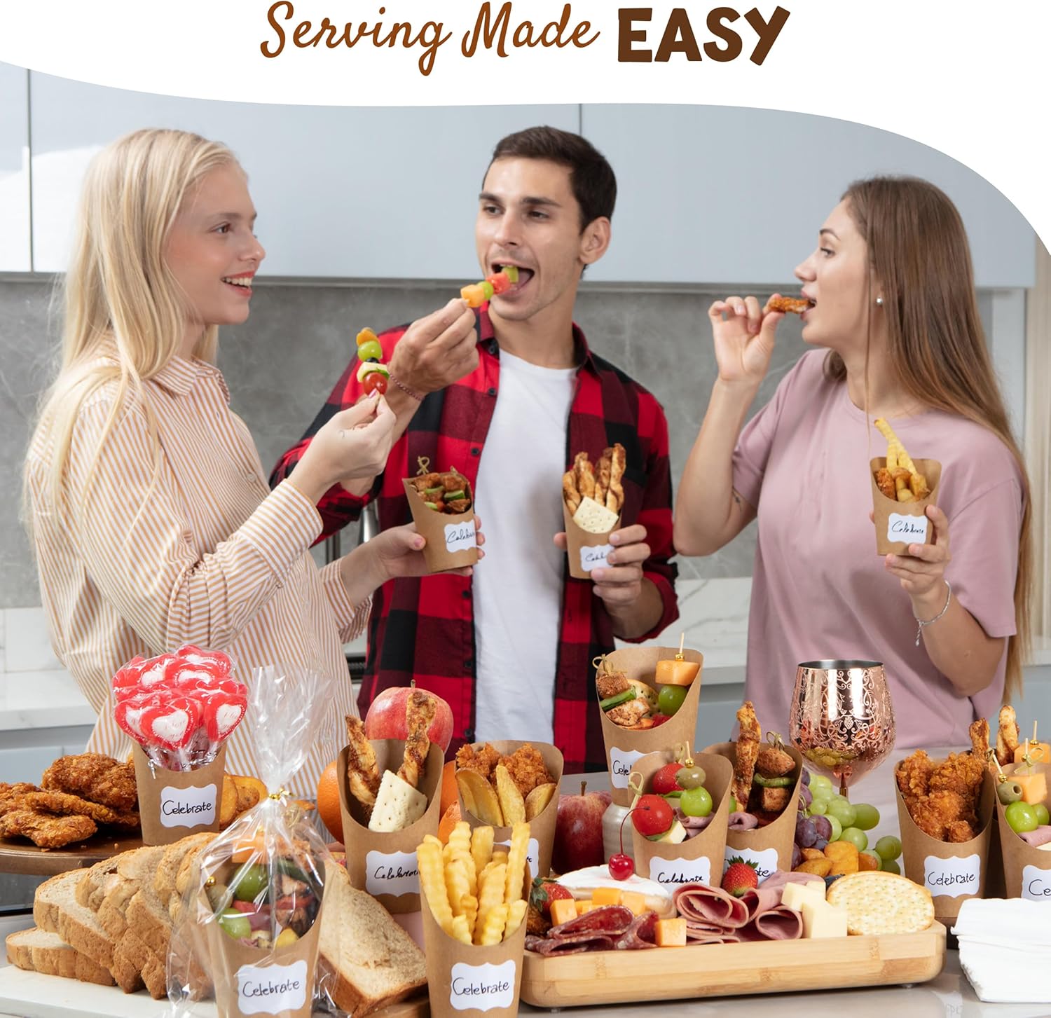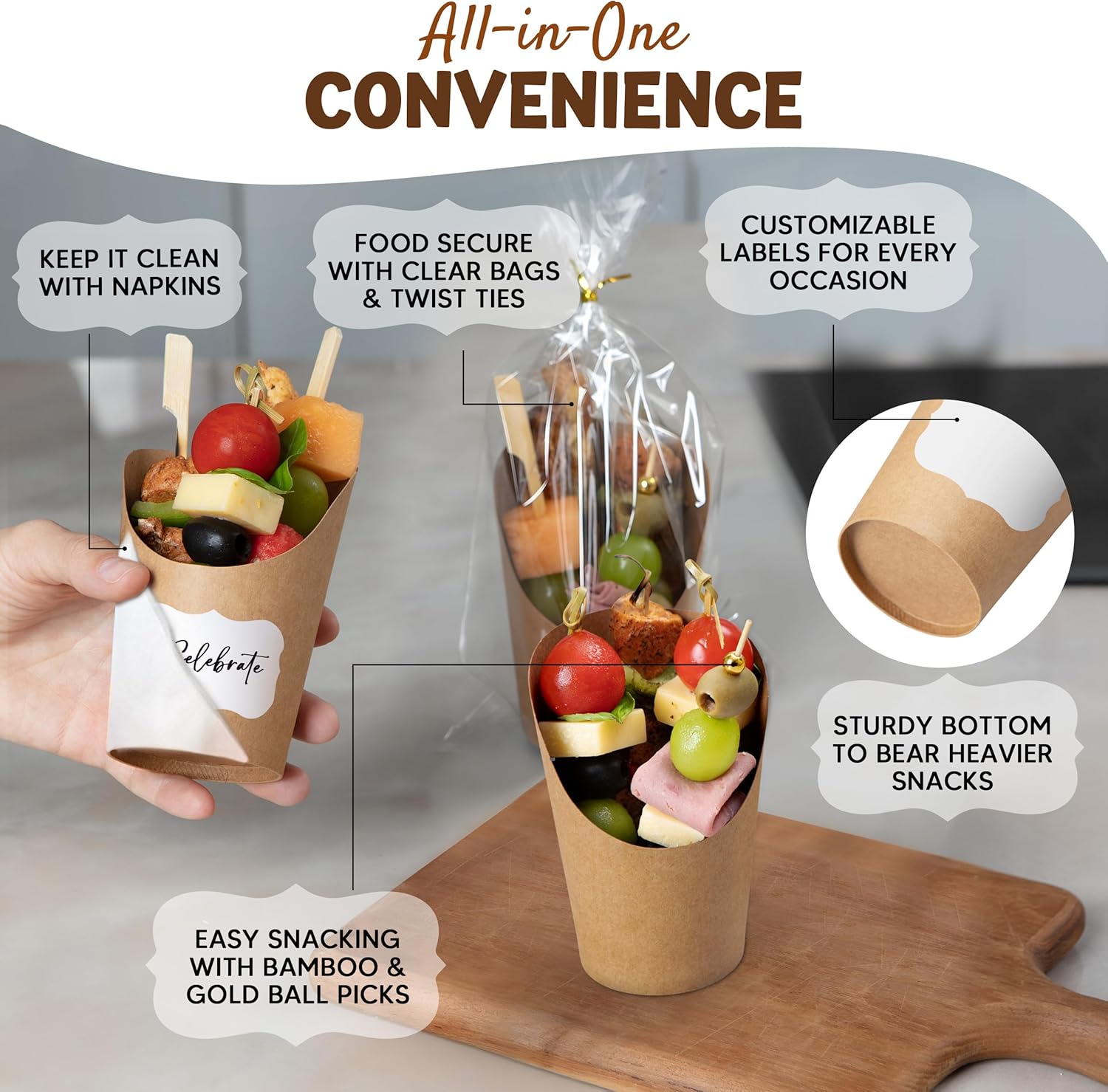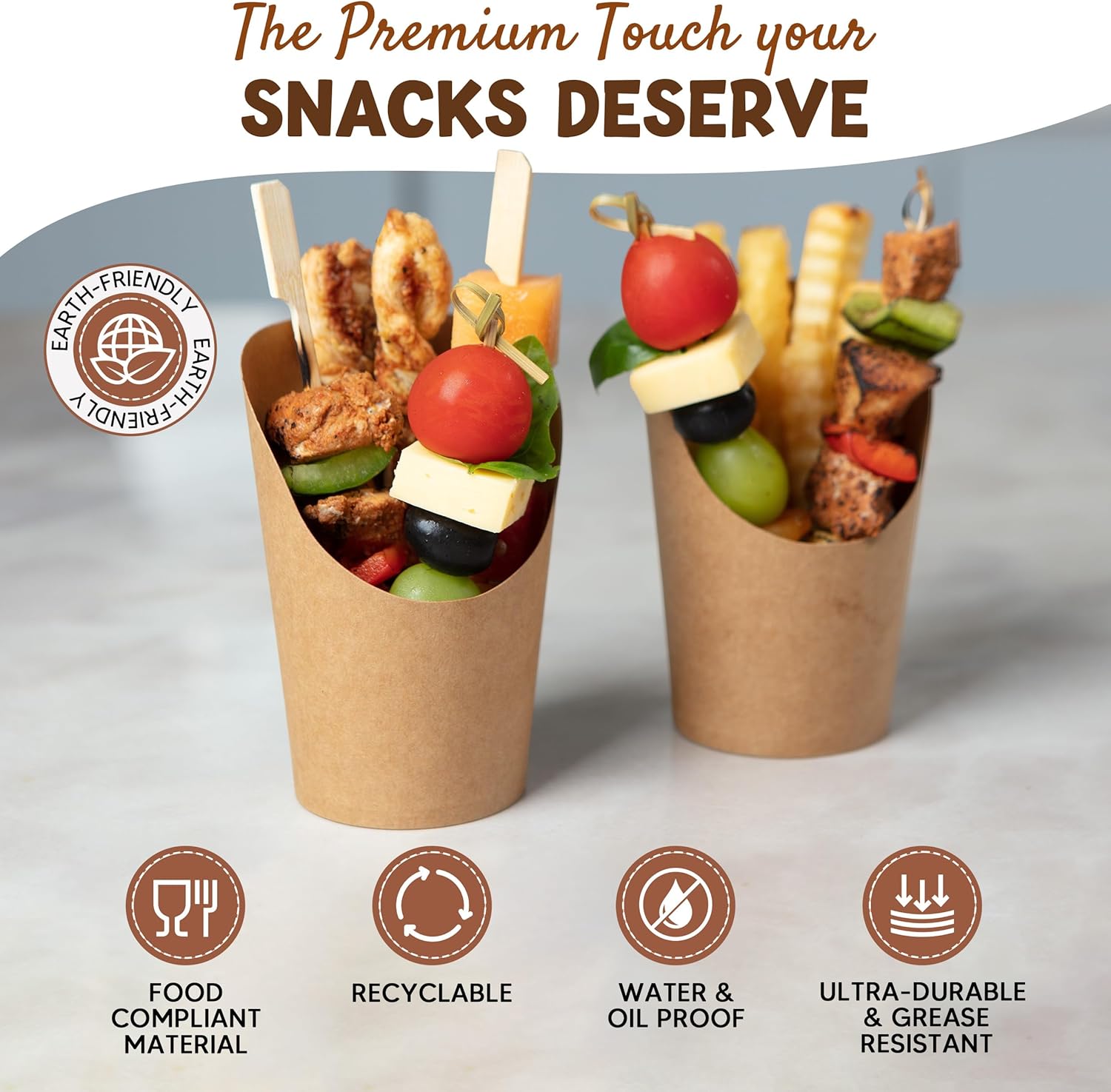 Durable Kraft Paper: Our appetizer cups are crafted with durable, 300gsm thick waterproof, and oil-resistant paper. The kraft paper cones are also food-grade, completely safe for all types of food, and do not lose shape or get soggy.