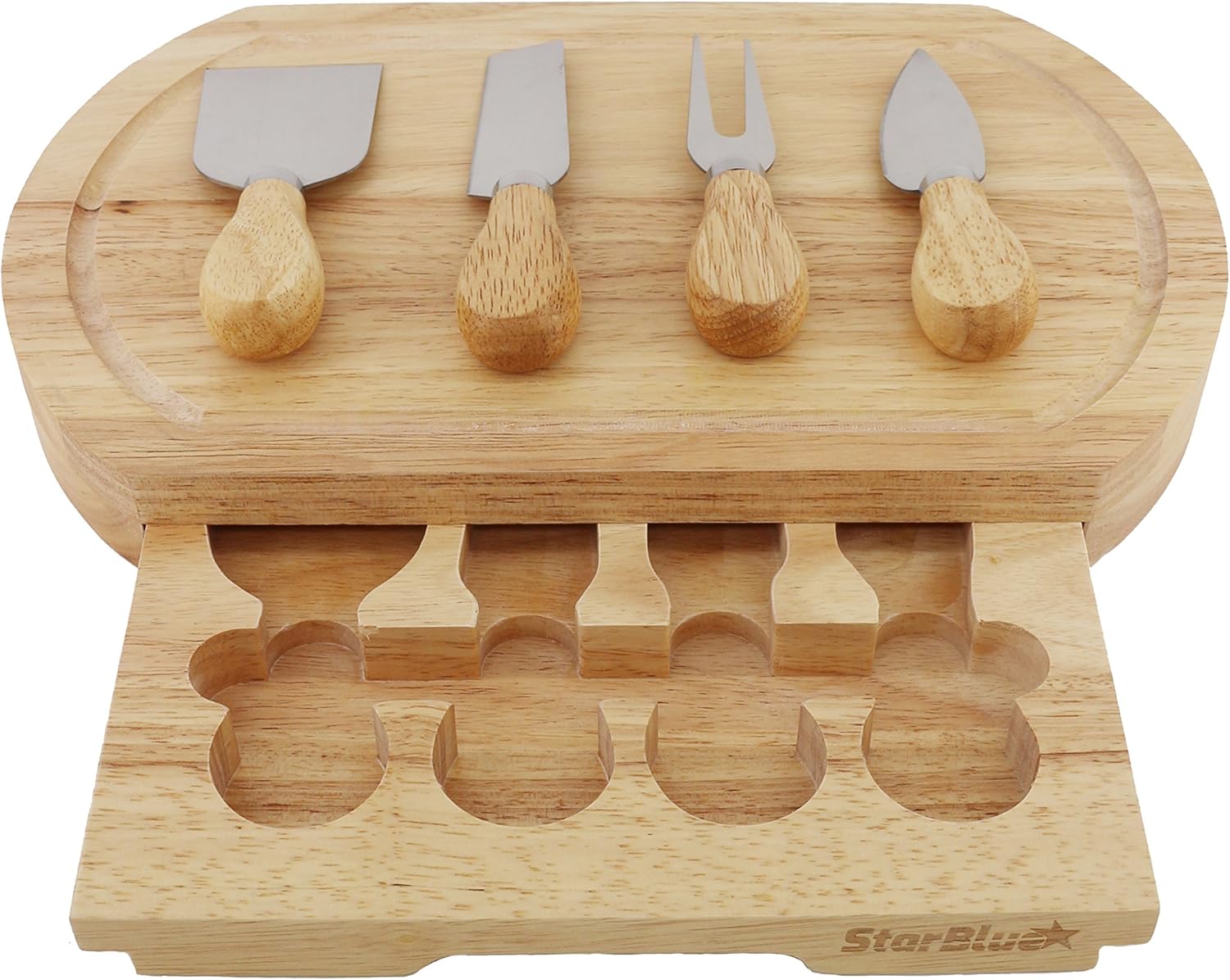 Cheese Board Set by StarBlue – with 4 Knives and Slide Out Drawer | Large Oak Wooden Cheese and Platter Cutting Serving Plate Tray | Best for Housewarming and Birthday Gift