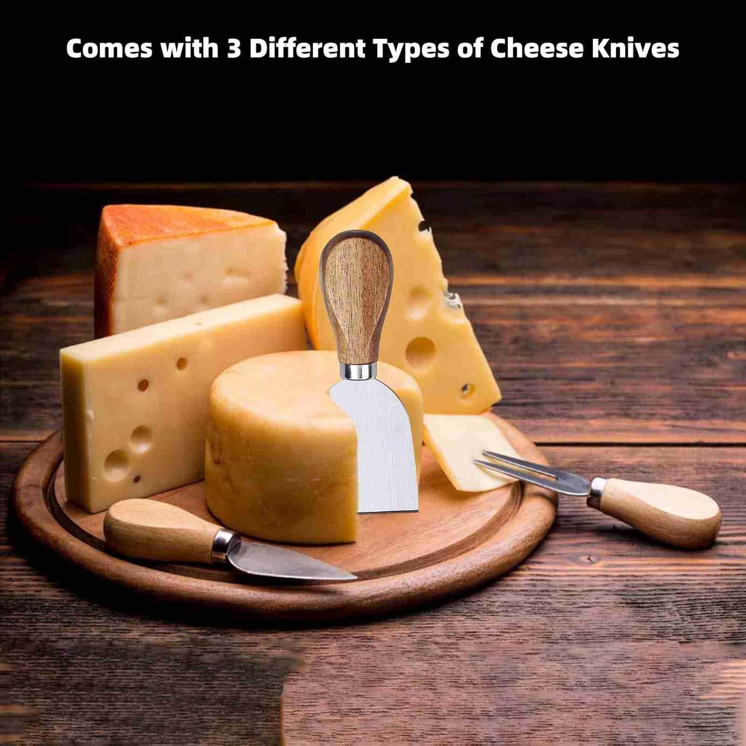 Our cheese board is made of high-quality wood, carefully polished and polished, with a smooth surface, natural color, durability, and not easily deformed.Our cheese board contains 3 knives of different shapes and sizes, which can be used to split various cheeses. Each knife is made of stainless steel, with a sharp blade and comfortable handle, making it easy to cut and pass cheese.