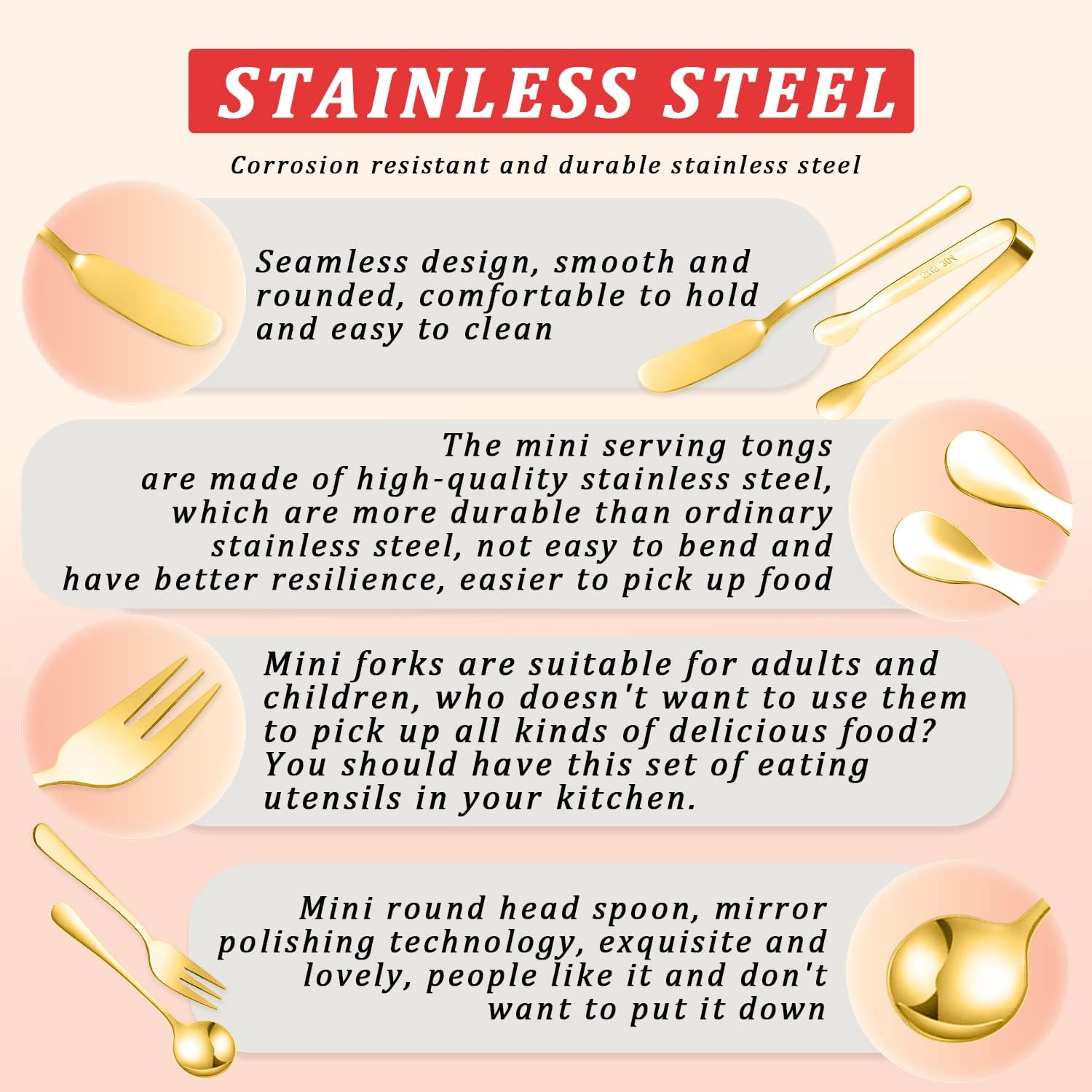 【Exquisite and lovely】: The butter spreader knives have an approximate length of 6.5 inches/16.5cm, the stainless steel mini serving tongs have an approximate length of 4.35 inches/11cm, the stainless steel small forks have an approximate length of 5.4 inches/13.8cm and the stainless steel small spoons have an approximate length of 4.5 inches/11.5cm. Exquisite and small size, simple cleaning and convenient storage. Who doesn’t want to have such a lovely set of kitchen utensils?