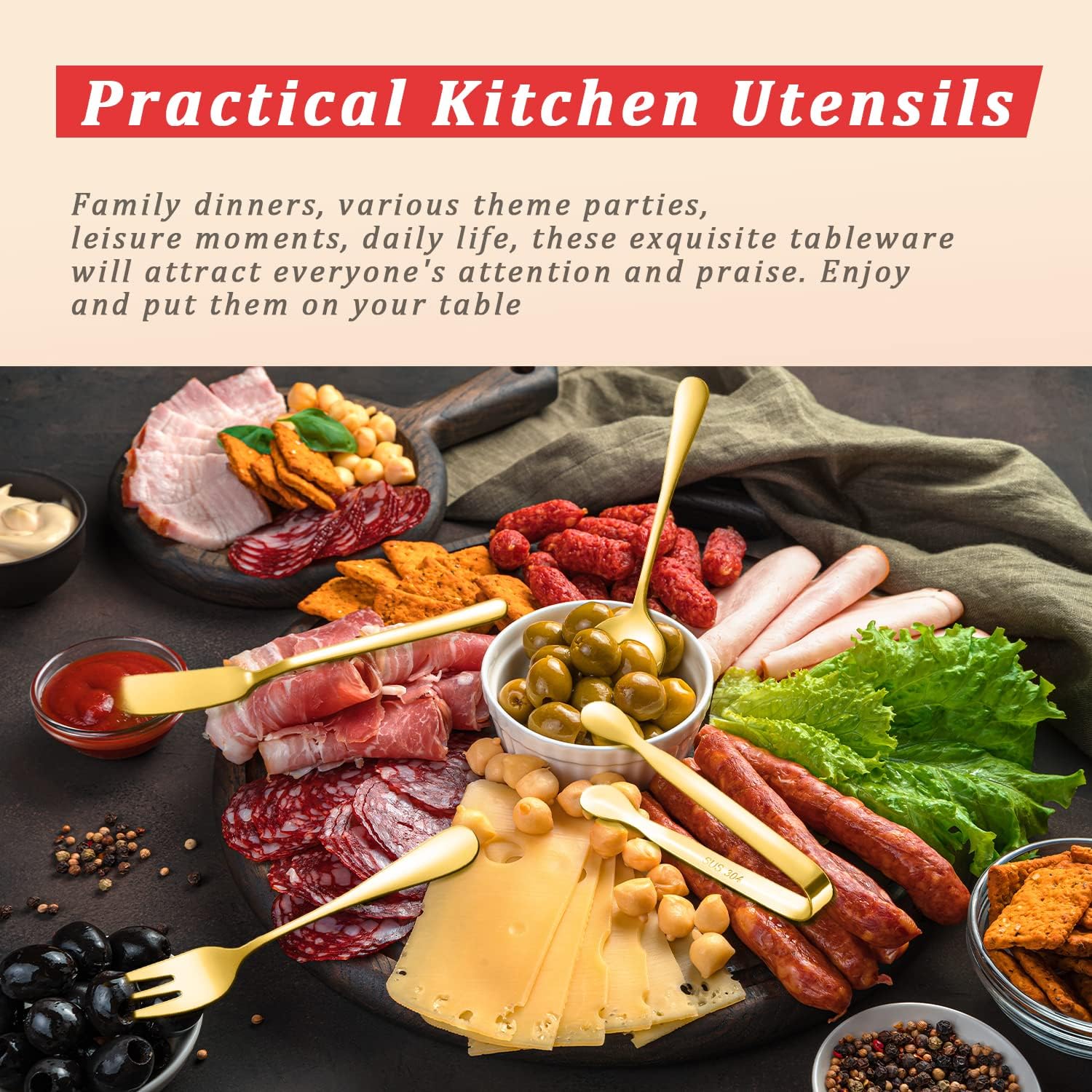 【Enough quantity】: Set includes 4 pieces cheese butter spreader knives, 4 pieces mini serving tongs, 4 pieces small spoons and 4 pieces small forks, which are made of high-quality stainless steel and advanced integrated technology, exquisite and durable. The set can be used for cheese, butter, jam, peanut butter, pastries, watermelon, strawberry, appetizers, pickle, charcuterie. It is an excellent kitchen gadget. Can be shared with relatives, friends and neighbors as gifts, and will be praised.