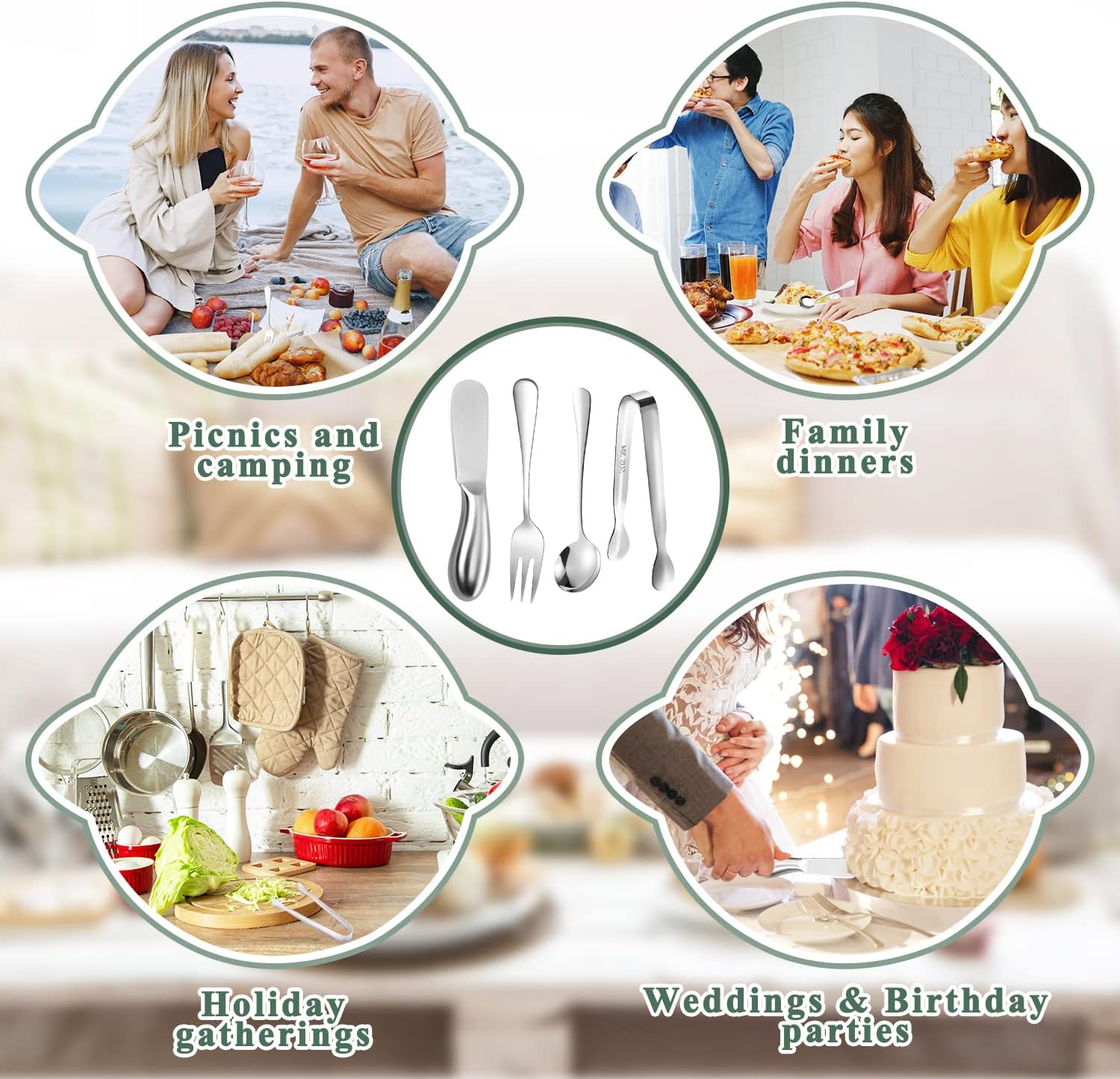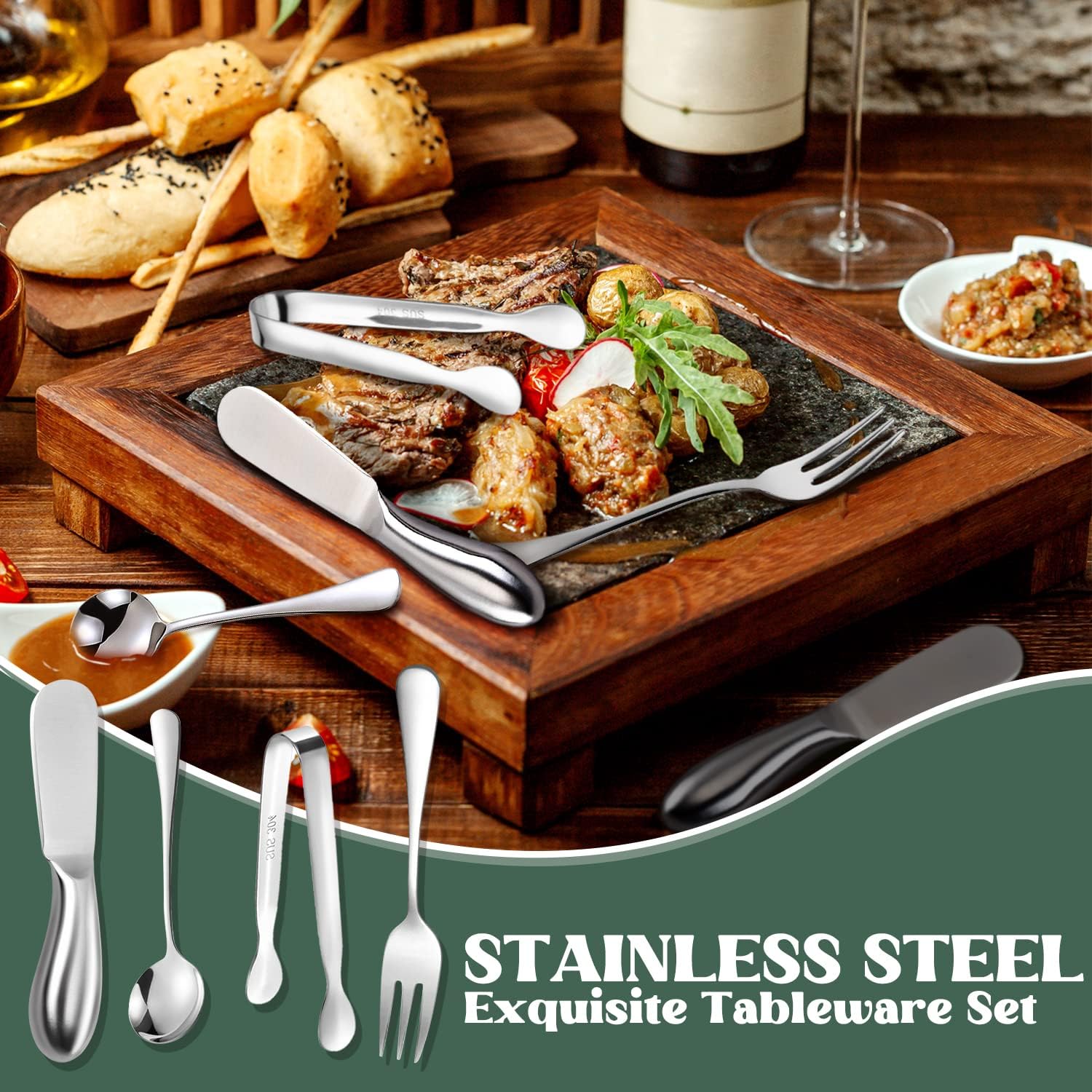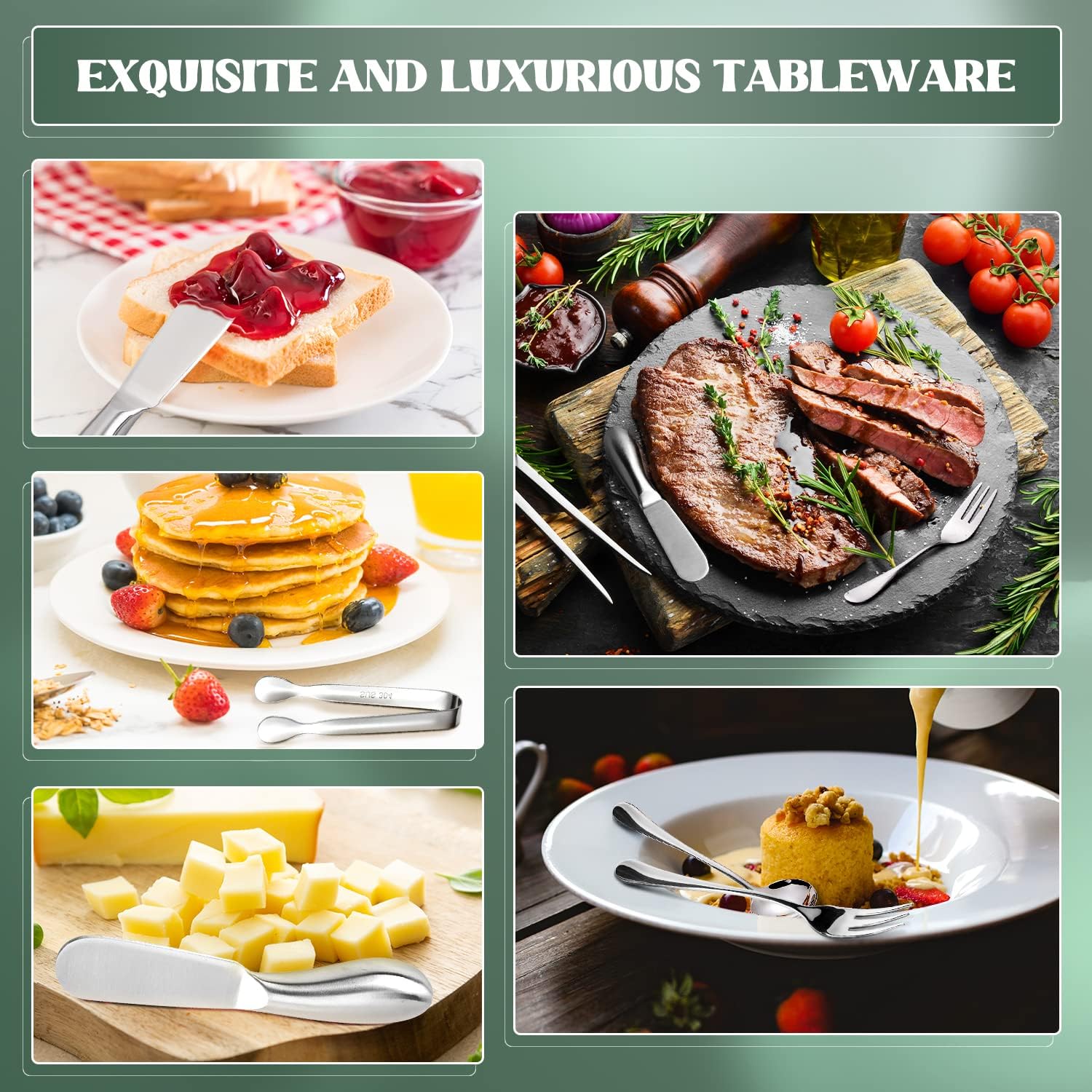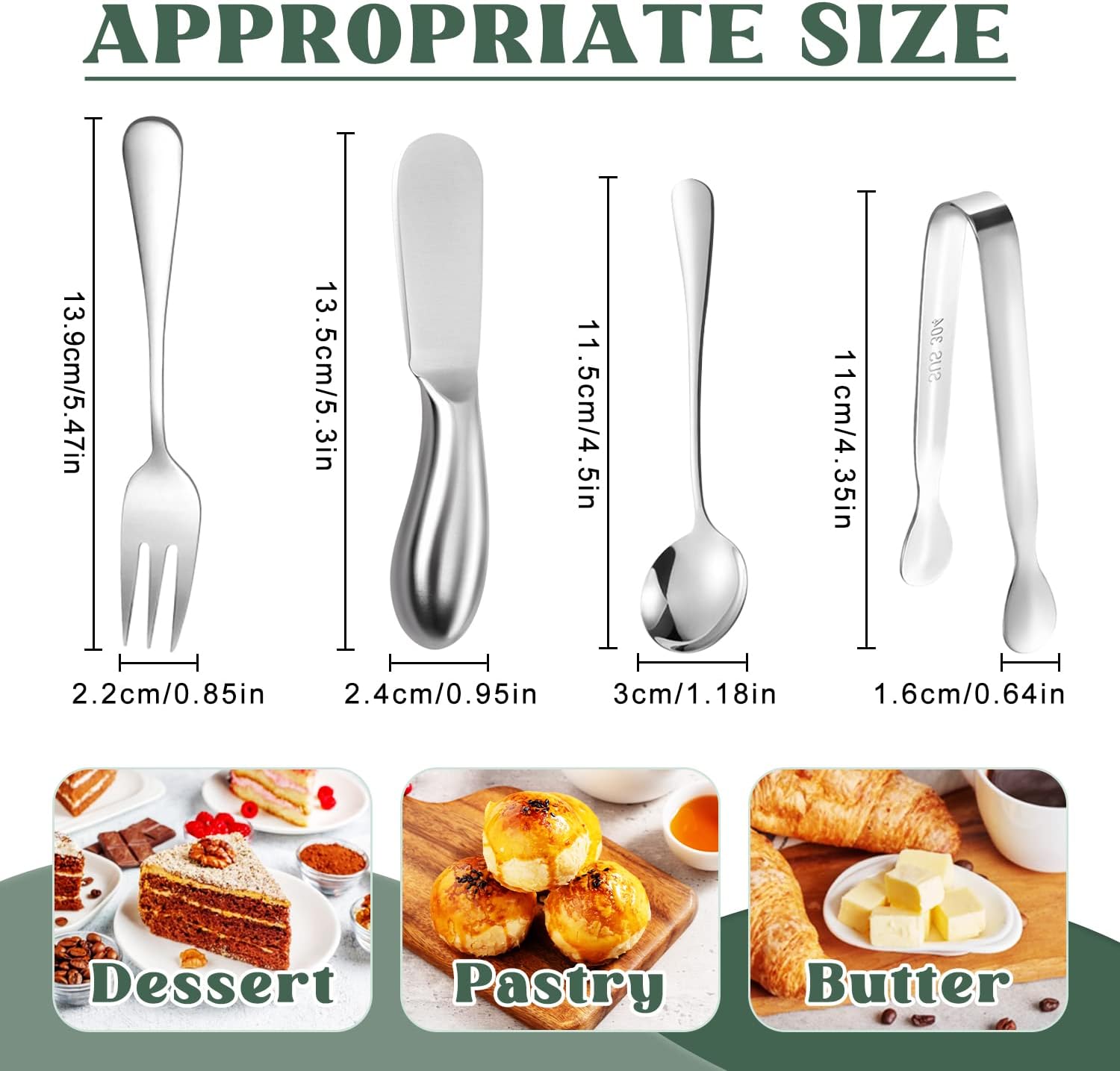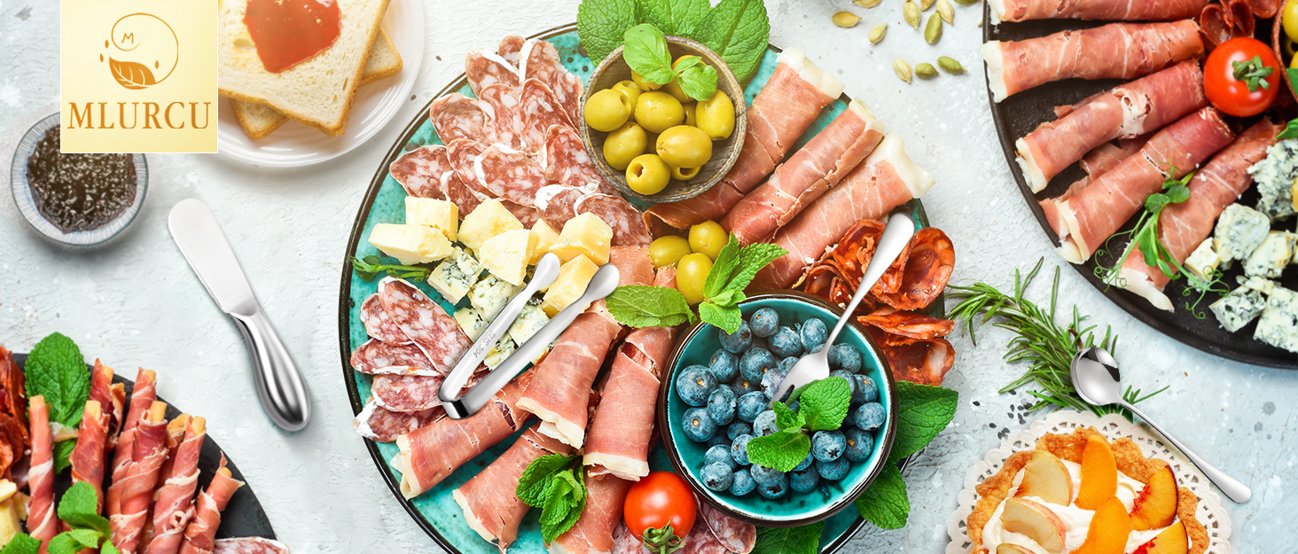 Butter spreader can be used to spread butter, cheese and various sauces. Spoon can be used with desserts such as cakes, ice cream, and the fork can be used to eat fruits, and the tongs can be used to clip the ice, etc.,they are very practical tools for appetizer and good gifts