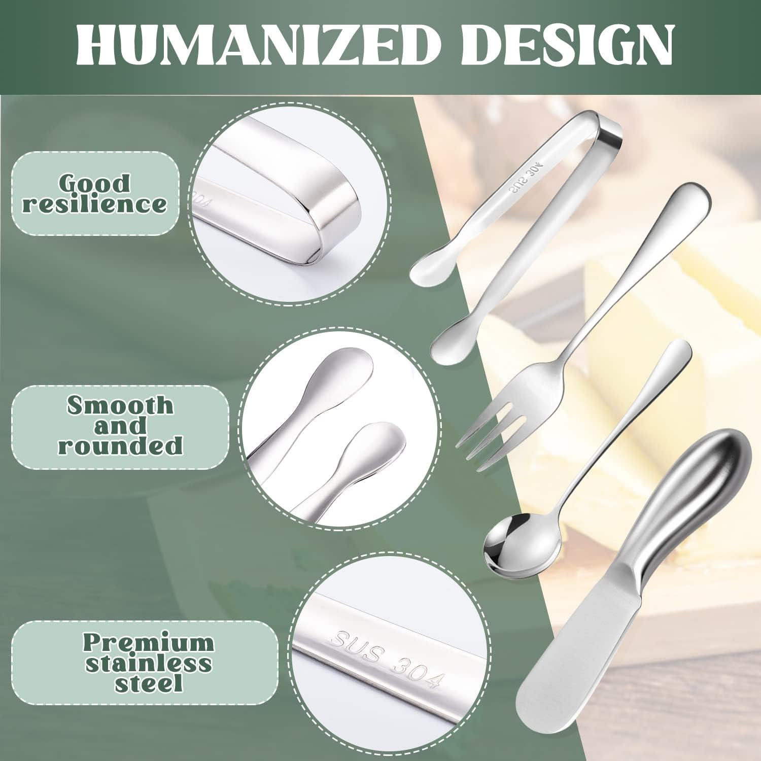 Butter spreaders are made of stainless steel with excellent quality. All the products are very thick, have a certain weight, round edges, and just right size, both exquisite appearance and practical