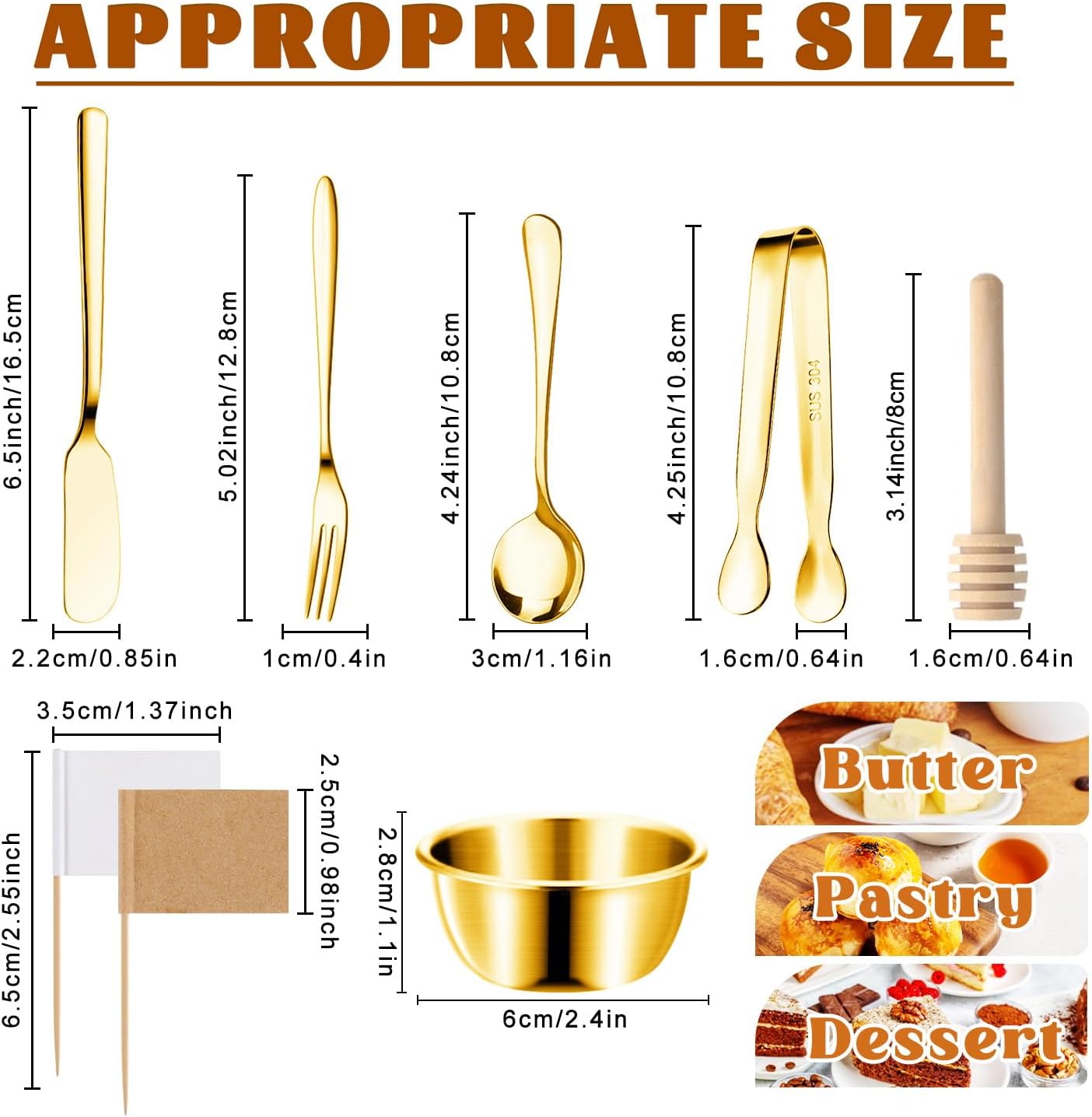 【Small and Exquisite Size】Butter spreader knife is about 6.5 inches / 16.5 cm, mini serving tong is about 4.3 x 0.64 inches/11 x 1.6 cm,fork is about 5.04 x 0.41 inches/ 12.8 x 1.05 cm and spoon is about 4.25 x 1.18 inches/ 10.8 x 3 cm, honey dipper is about 3.15 inch/ 8 cm, small stainless steel dipping bowls is about 2.38 x 1.08 inches/ 6 x 2.7 cm, capacity approx. 50 ml/ 1.7 oz. Cheese knife set exquisite and small size, simple cleaning and convenient storage. Who doesn’t want to have such a lovely set of kitchen utensils?