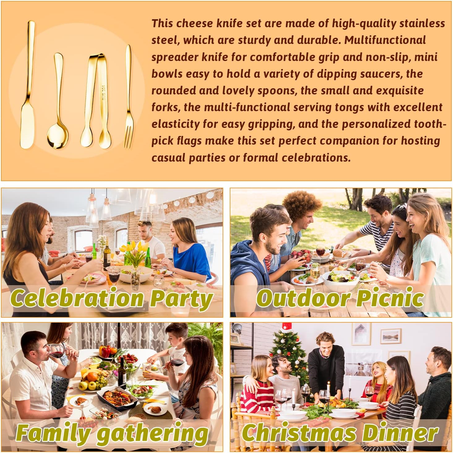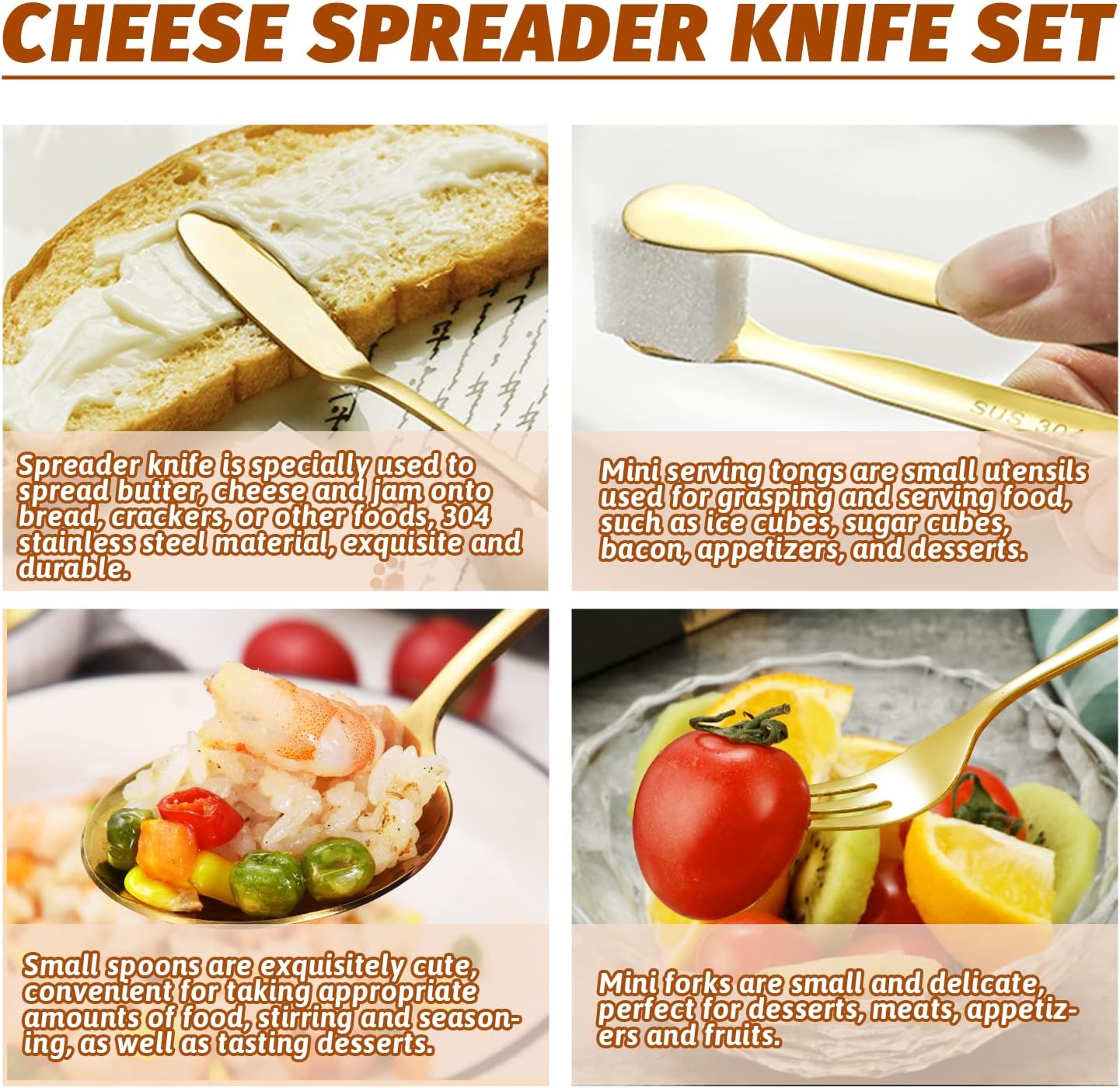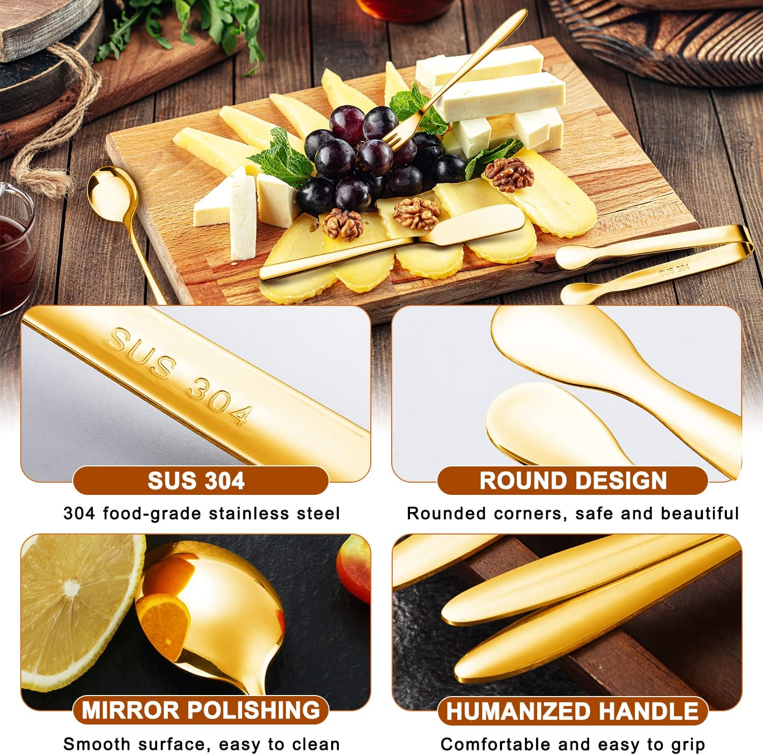 【Package Includes】Cheese butter spreader knives set includes 4 cheese knives, 4 mini service tongs, 4 small spoons, 4 small forks, 4 mini dipping bowls, 4 honey dippers and 40 toothpick flags, which are used for cheese, butter, jam, appetizers and pastries making. It is enough to meet your daily needs.