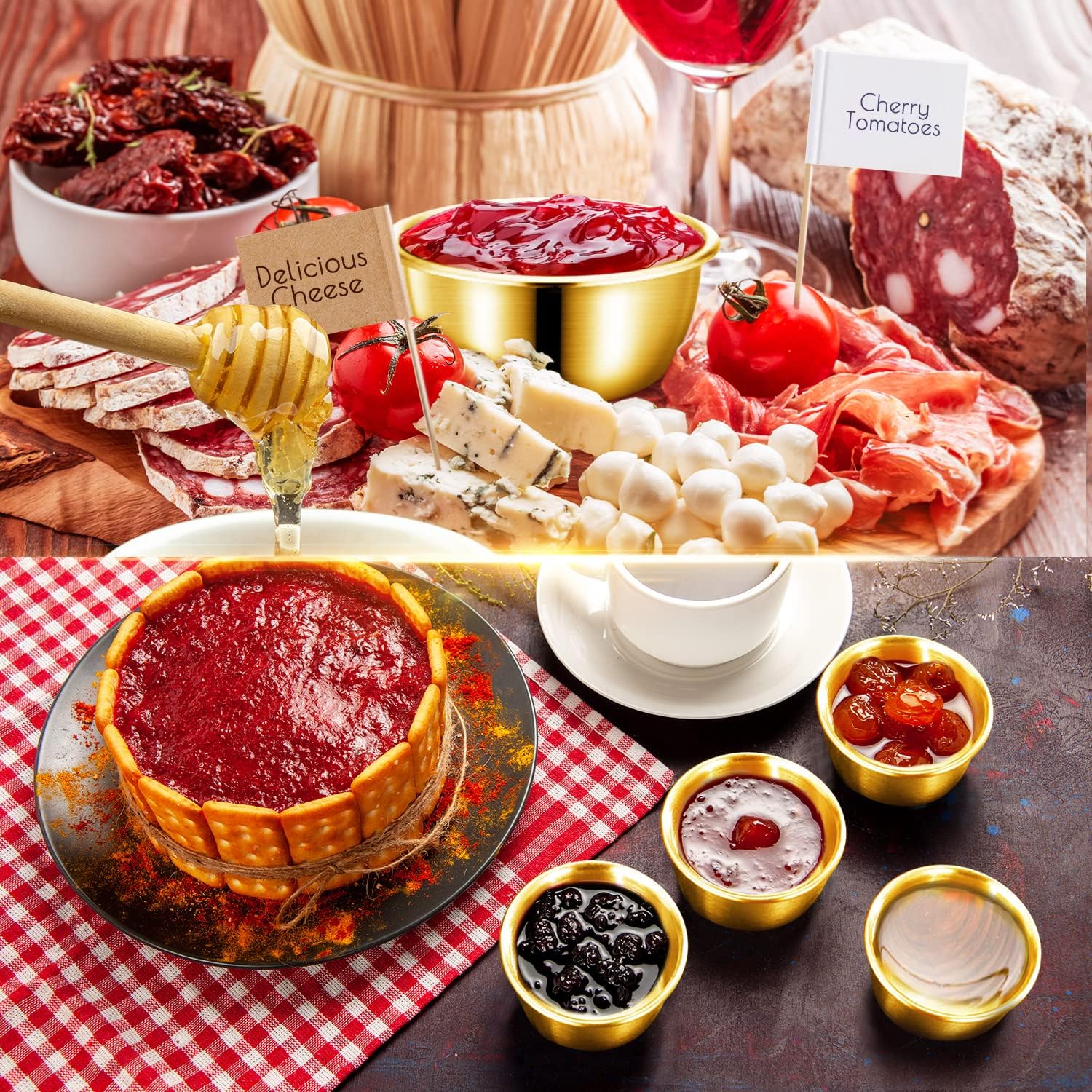 【Good Helper for You】Spreader knife used to cut and apply cheese, butter, jam, peanut butter, etc. Service tongs used to pick up sugar cubes, ice cubes, lemon slices, pastries, desserts, boiled eggs, appetizers, etc. Spoons and forks used to taste all kinds of delicious food. Sauce bowls used to hold condiments, jam, honey, dessert, etc., Toothpick flags can be used as cheese markers, butter labels and other charcuterie labels. They are excellent with charcuterie board, very suitable for daily life, picnic, barbecue party and so on.