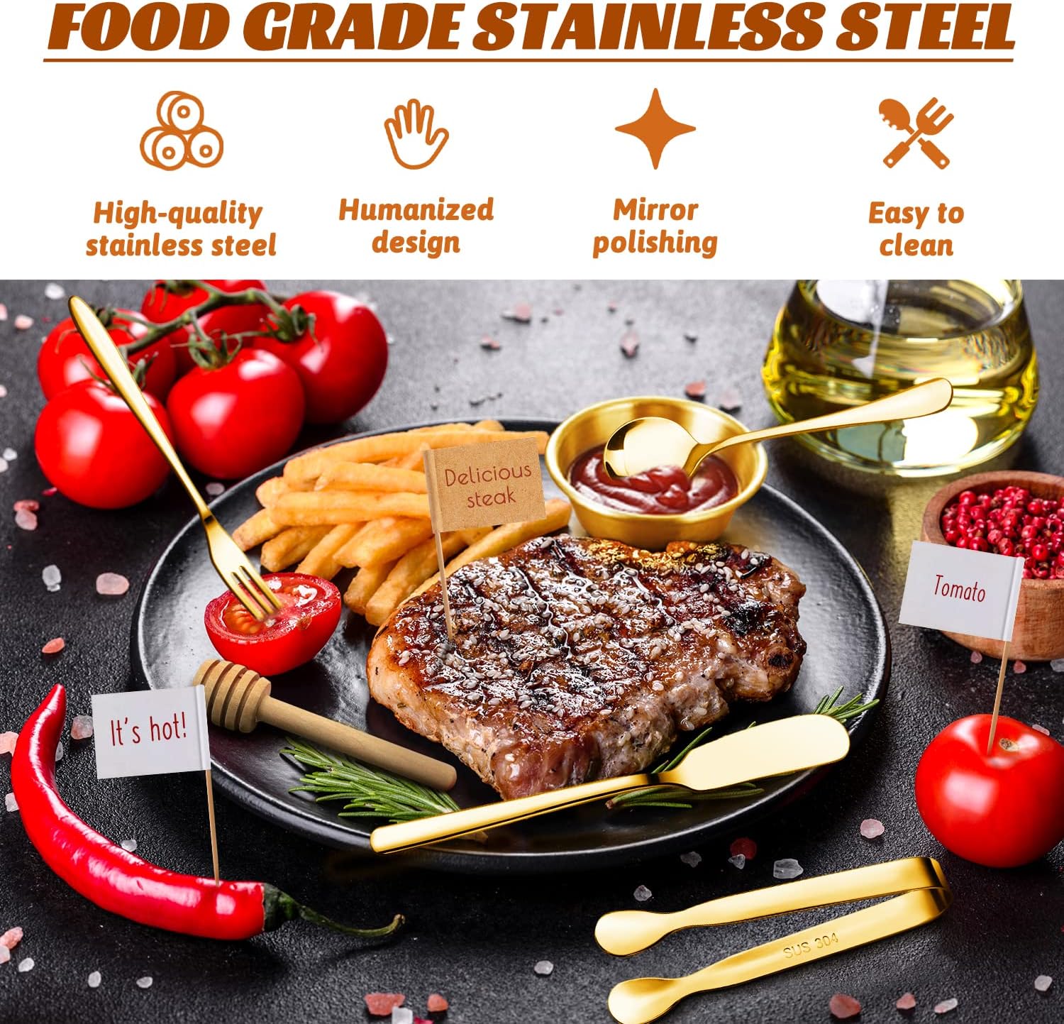 【Premium Stainless Steel Material】Dipping bowls, spreader knives, serving tongs, forks and spoons are made of premium stainless steel and advanced integrated technology for durability, abrasion and corrosion resistance. They used mirror polishing technology, surface smooth and bright, exquisite and beautiful, and easy to clean. Everyone will like them, they’re your best choice.