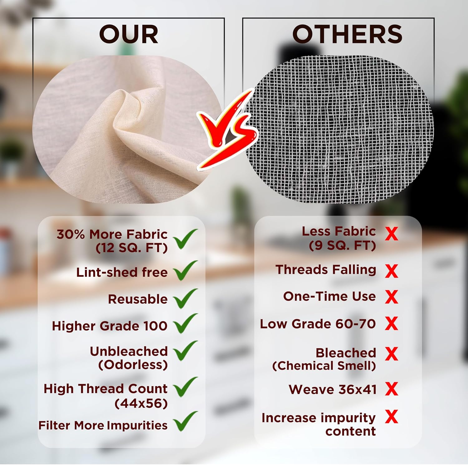 LINT-FREE PERFECTION : Crafted solely from virgin cotton, our cheese cloth guarantees the highest quality and a lint-free experience. With no recycled fibres or impurities, use it confidently for multiple layers of filtration. Seamlessly overlap hemmed pieces for efficient filtering, ensuring culinary perfection.