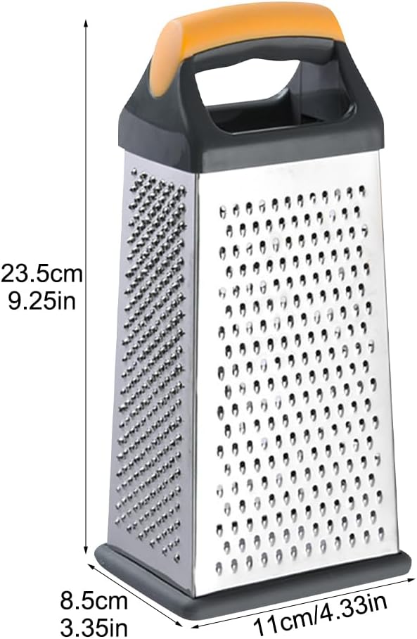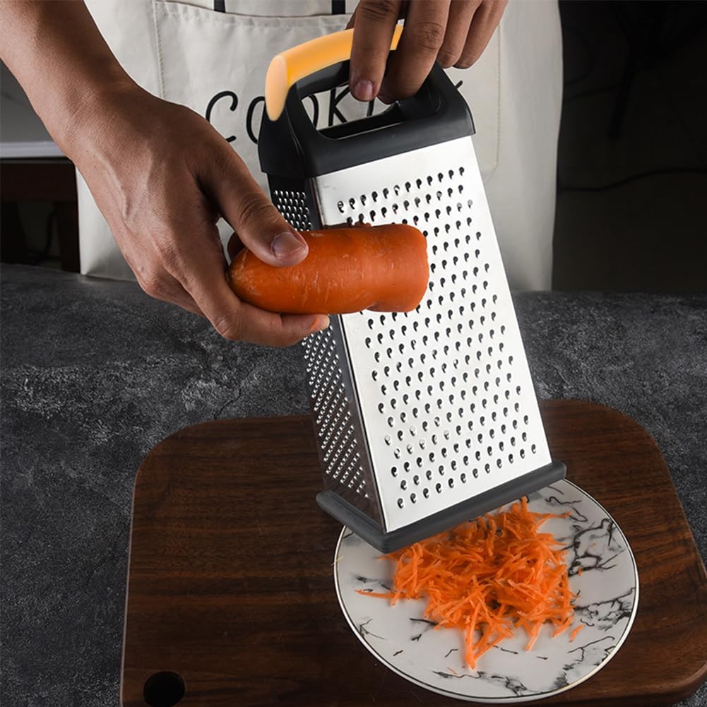 Multi-Purpose 4-Sided Grater: This versatile box grater efficiently processes cheese, vegetables (like shredded carrots), citrus fruits (lemon zester), chocolate, coconut, and more. Great for preparing parmesan cheese grated or shredded cheddar cheese.