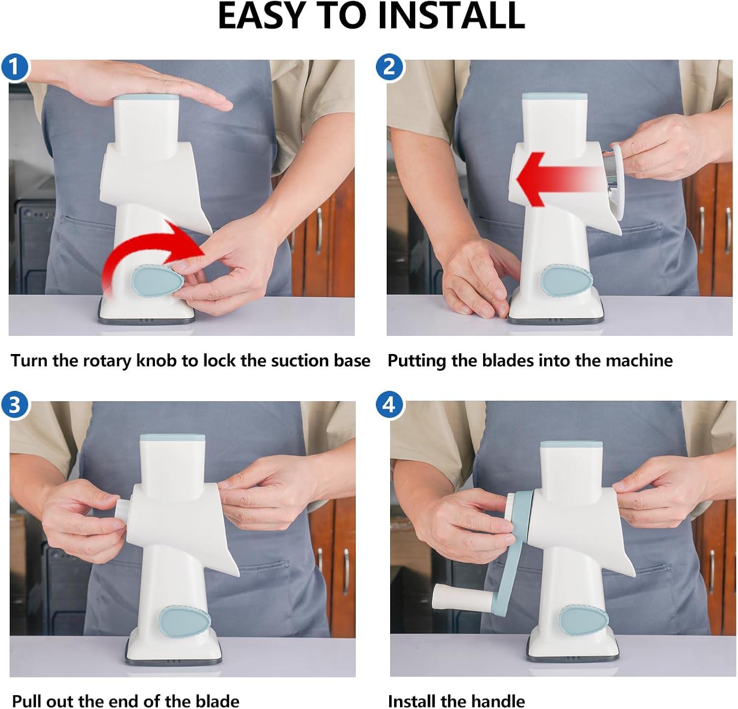 Easy To Clean and assemble: The rotary cheese grater can be taken apart and cleaned separately. The three blades and handle are removable, very convenient for your kitchen storage,Blades are dishwasher safe
