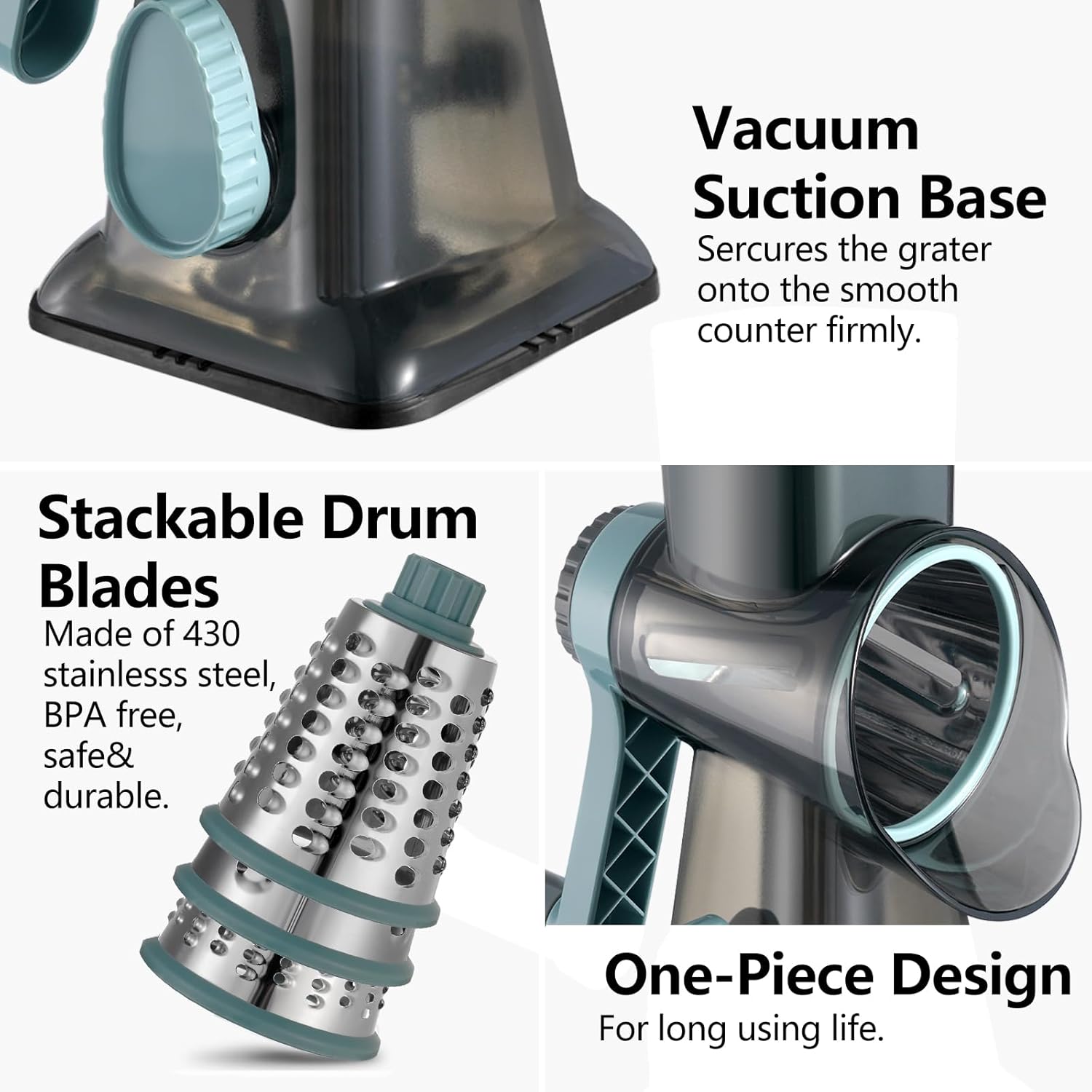 3 IN 1 cheese shredder: Equipped with three drum blades,these are crafted from high-quality stainless steel,make slicing, shredding and grinding easy, and can handle a variety of ingredients, including all types of cheese, vegetables, nuts, and more. Three interchangeable blades can meet daily needs