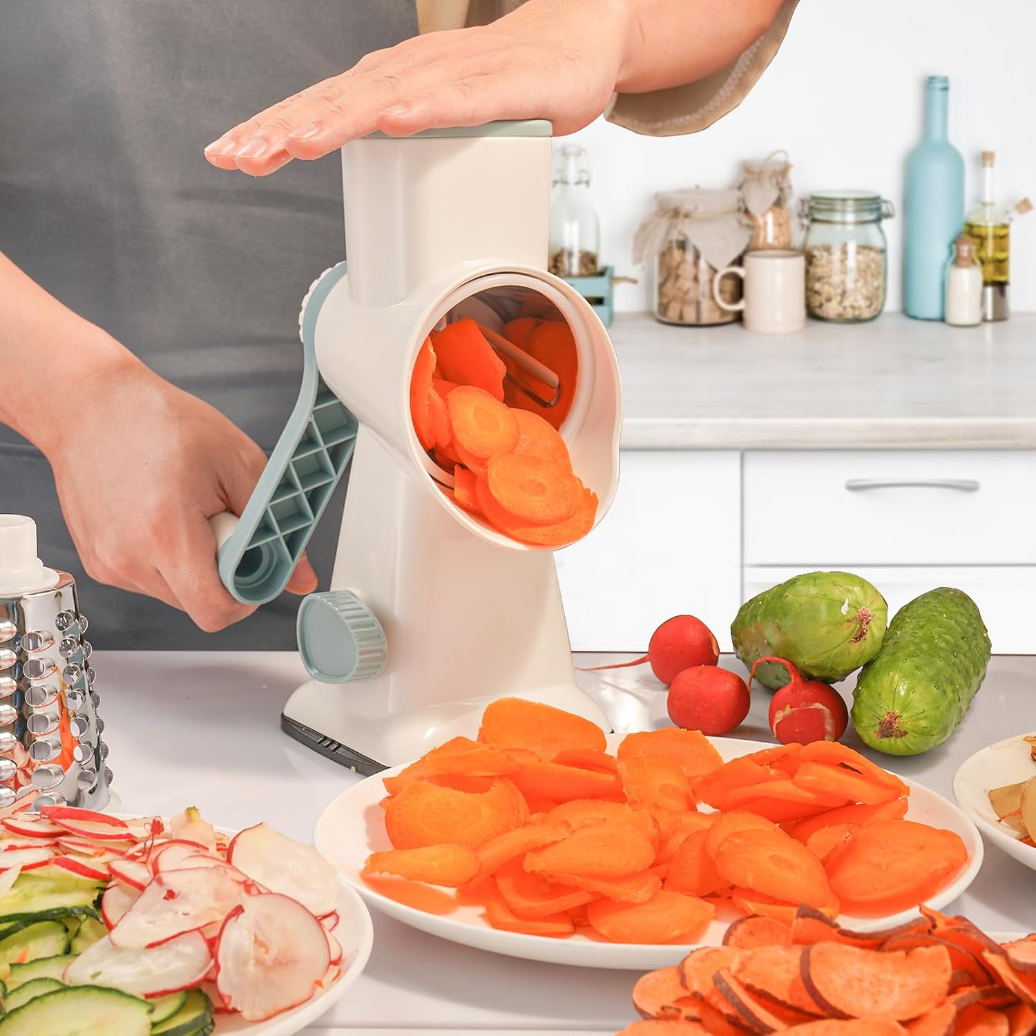 Cheese Grater Hand Crank Rotary Vegetables Shredder with Handle, 3-in-1 Graters with Interchangeable Blades and Strong Suction Base Multifunctional Slicer for Kitchen,white