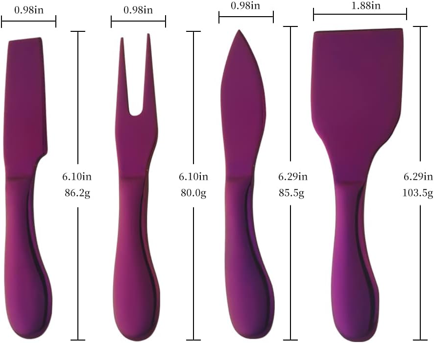 🧀PACKAGE:Purple- 1 mini spade knives for crumbly cheese, 1 mini forks to chuck cheese,1 narrow plane knives to slice semi-hard cheese and soft cheese, 1 cheese spreader knives for creaming