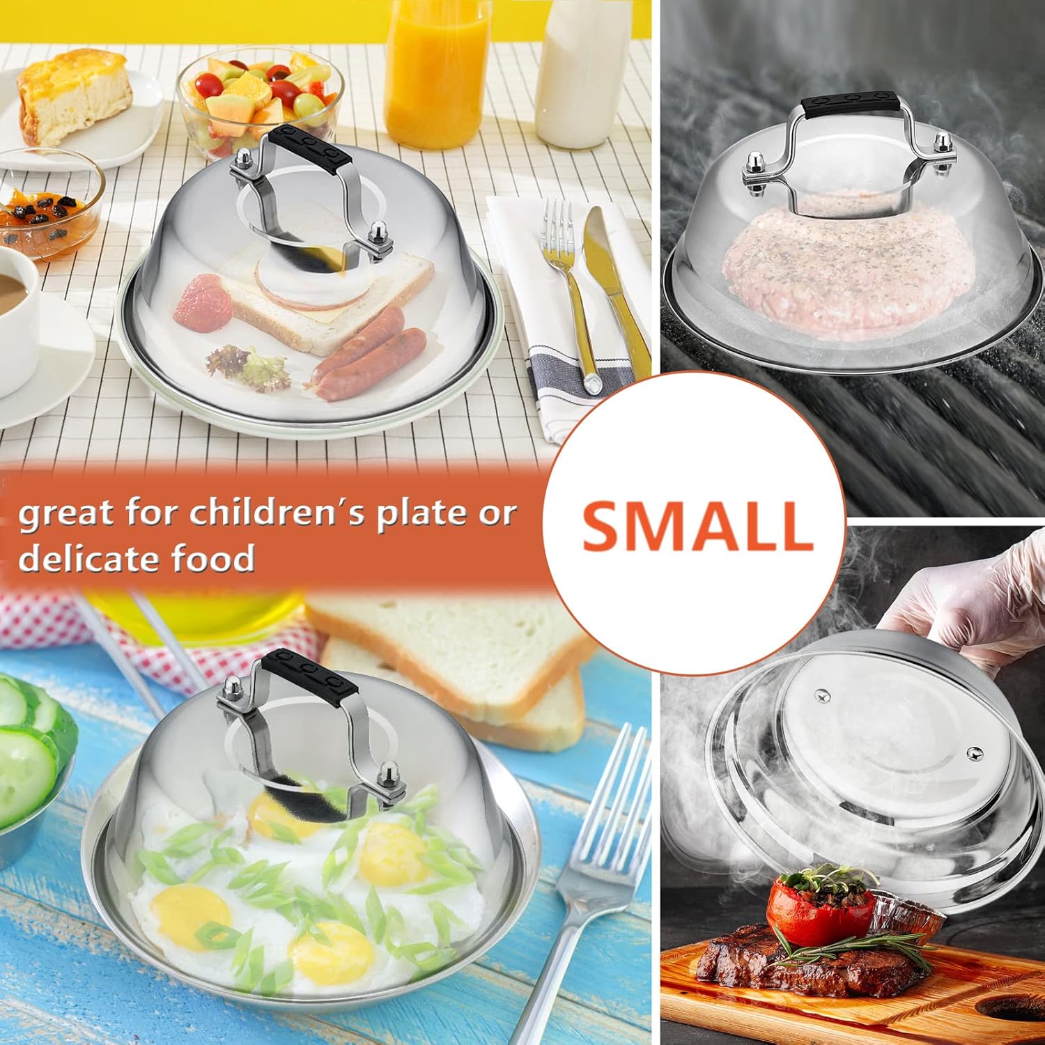 HaSteel 3pcs Cheese Melting Domes are made of high quality stainless steel to ensure their durability. Superior thicker metal and sturdy construction are strong enough to avoid surface of steel pan dents. Ergonomic design of silicone handles in 6.5in and plastic handle in 12in and 9in provide you a comfortable grip. Heat resistant material easy to deal with high temperatures to protect your hands from scalding. Matte finishing and elegant looking make cleaning in a breeze and dishwasher safe. Rust-free stainless steel screws firmly attached on the handle without coming apart and sturdy enough allow you to cook with confidence and easy like a master.