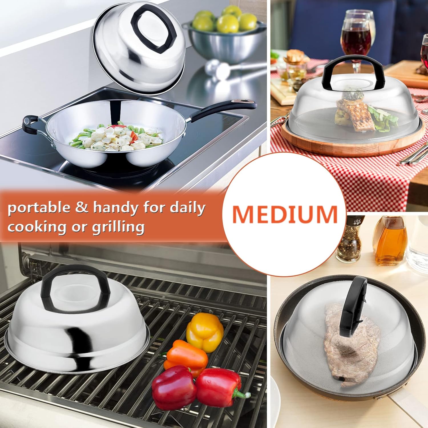 [ENOUGH CAPACITY] – Our cheese melting domes measure large 12in, medium 9in and small 6.5in, Different sizes can meet all of your cooking need, Featuring sufficient room to make cooking much easier, Great for covering grilled pizzas, sandwiches, veggies, patty burgers, steaks, quesadillas with smoky flavor and more
