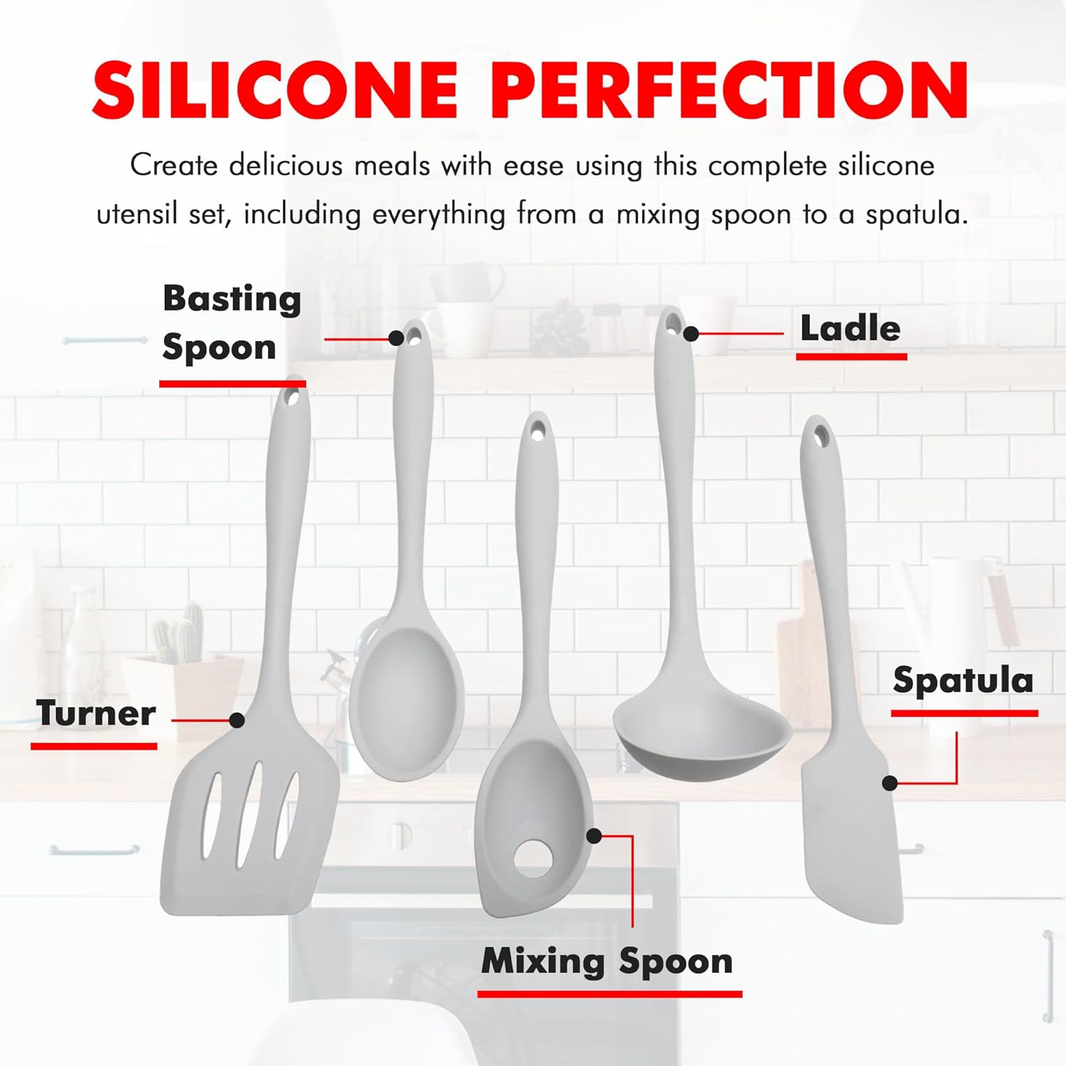 Complete Kitchen Solution: Elevate your culinary experience with this 5 piece silicone kitchen utensils set that includes a mixing spoon, ladle, spatula, and more. This cooking set includes everything you need to whip up your favorite dishes, from flipping pancakes to stirring sauces.