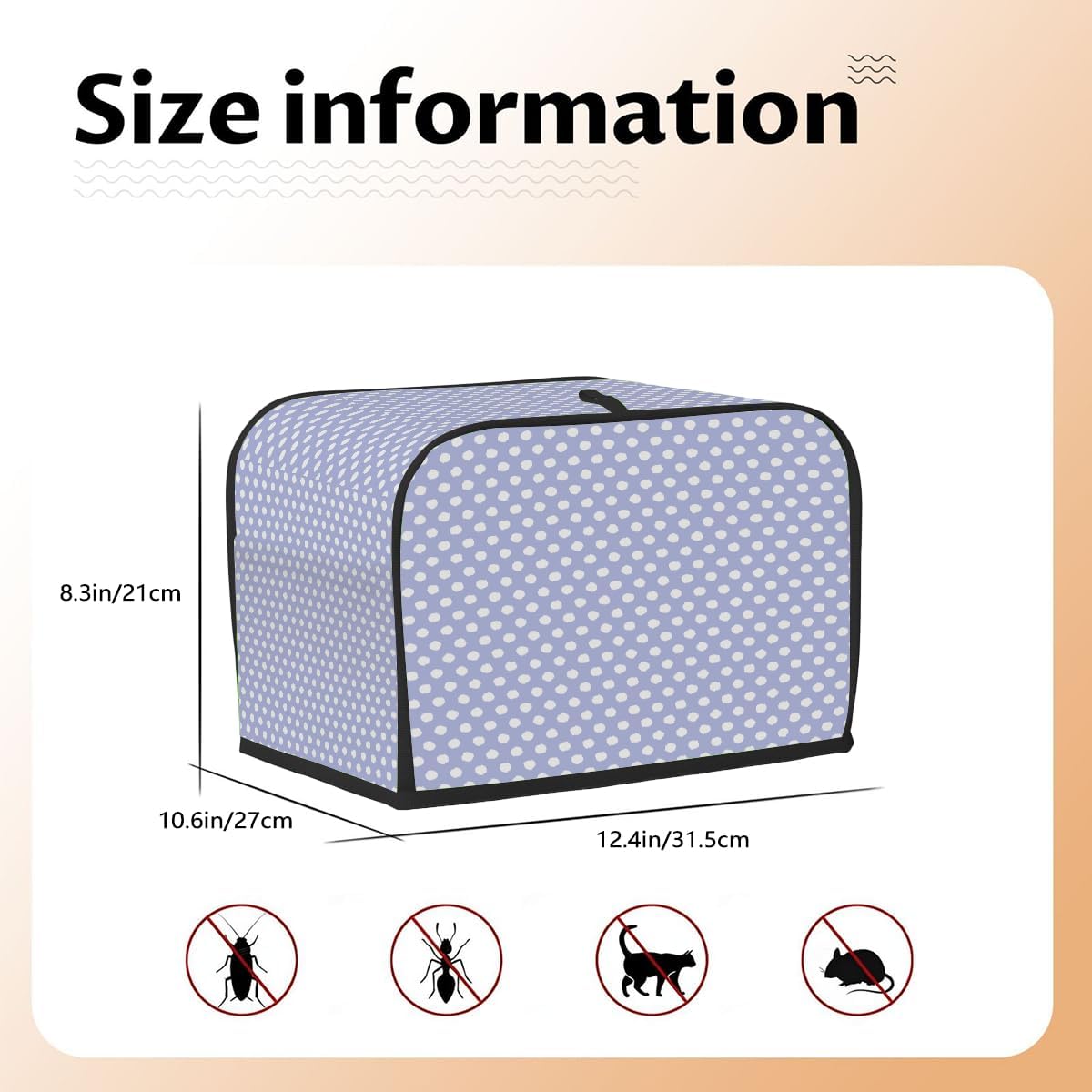 Wide Application Sizes: Two size are available for your toaster cover. S: 7.5 * 7.9 * 11.4 Inches, this standard fit 2 slice wide slot toaster oven. M: 8.3 * 10.6 * 12.4 inches, this standard fit 4 slice wide slot toaster oven. The toaster cover can also be used for broiler appliances and most kitchen small appliance