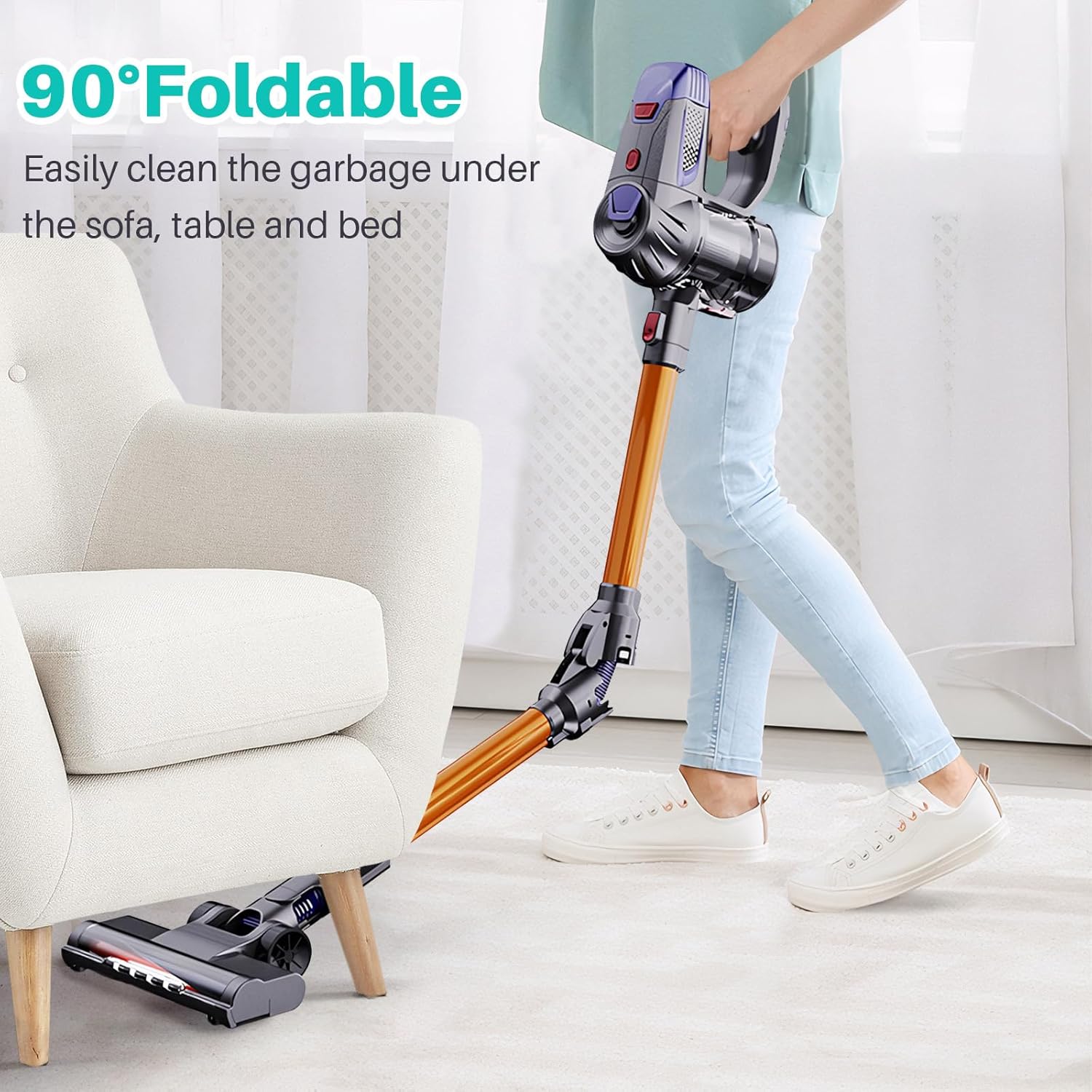 The advanced HEPA filtration system captures 99.97% of dust, releasing clean air—Foldable stick vacuum cleaner with LED headlights ideals for families with pets or dust sufferers, ensuring a healthier home environment