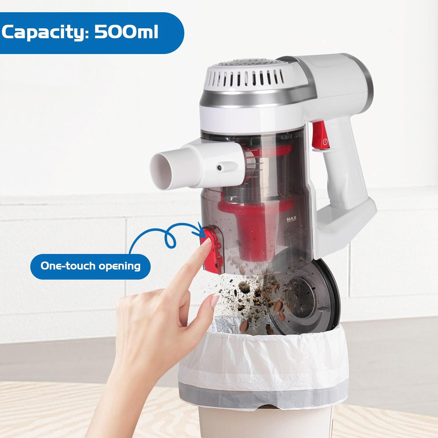 Removable Rechargeable Battery: The cordless vacuum cleaner has a powerful battery module, including six 2000mAh lithium battery, which provides long-lasting endurance for your home cleaning. It works for 20 minutes at high gear and 30 minutes at low gear, fully meeting your cleaning needs