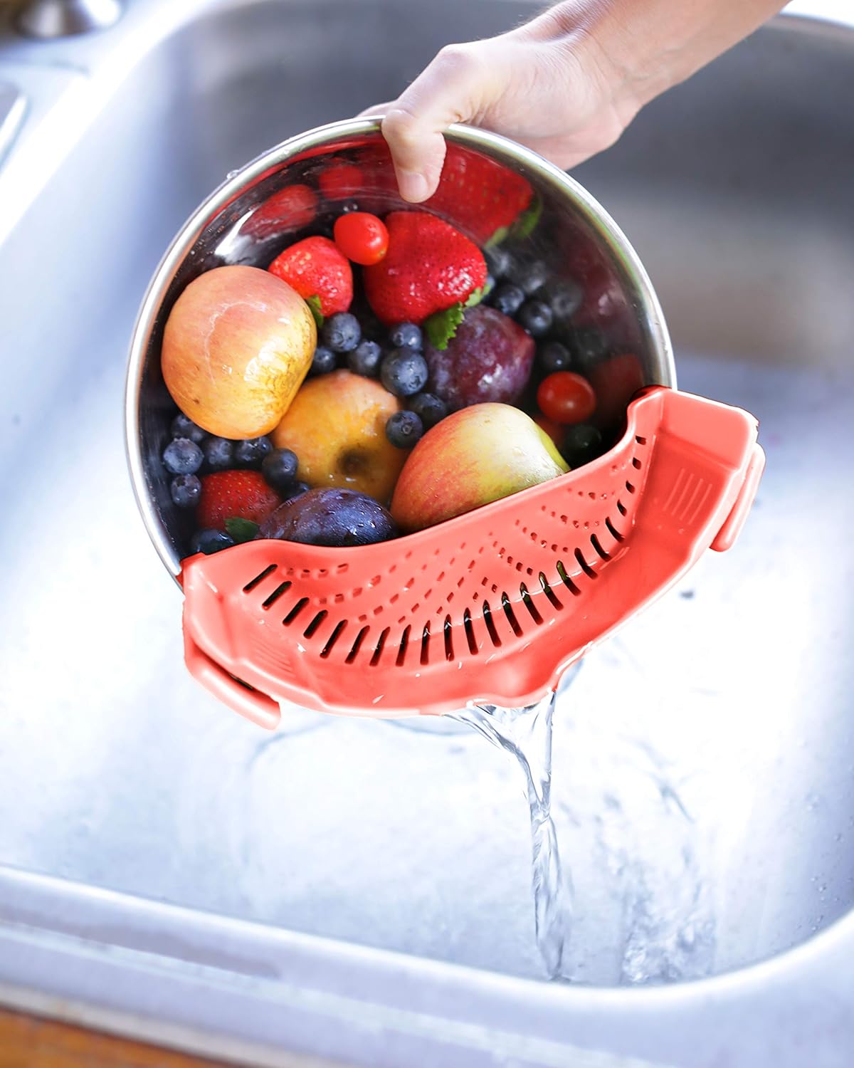 Clip On Kitchen Food Strainer for Spaghetti, Meat, Pasta, & Ground Beef Grease, Colander & Sieve Snaps or Clips Onto Bowls, Pots & Pans Includes Silicone Drainer, Brush & Garlic Peeler (red)