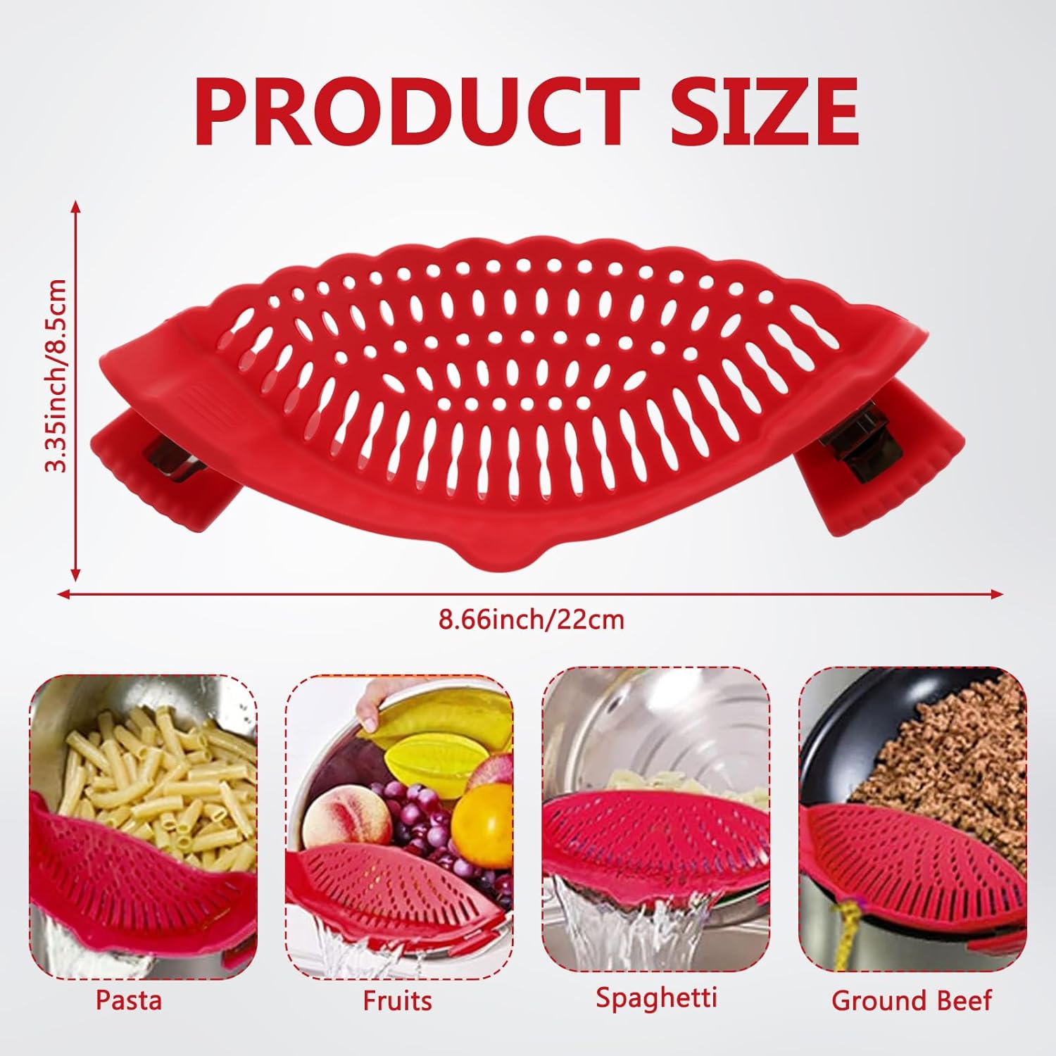 Clip On Strainer Silicone and Food Clip – Pot Strainer Clip On for Draining Pasta, Vegetables & Meat – Heat Resistant Silicone Colander, Dishwasher Safe Kitchen Gadget (Red)