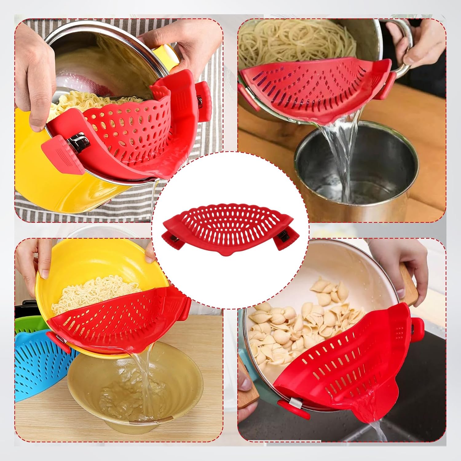 1.Get one pot strainer clip on silicone plus a food tong. Practical for home users, seniors, and chefs. This clip on strainer simplifies kitchen tasks, making it a thoughtful gift. As essential colanders & food strainers, it reduces kitchen mess for smoother meal prep.