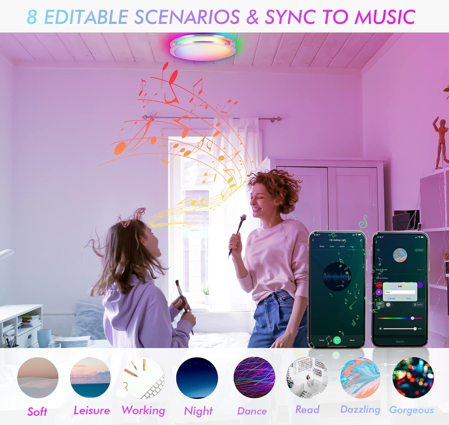 Music Sync +14 Scenarios: With wide range of CCT and RGB color, the light is available to 14 scenarios, which meets your different lighting needs, reading, working, sleeping or dancing etc. You can also make it sync to music, lighting would follow the change of the music beats, having fun with family and friends now!